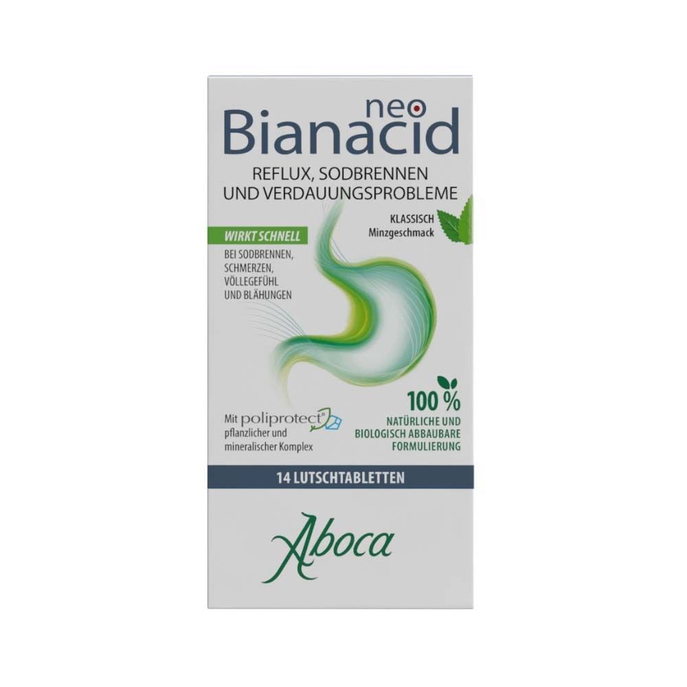 23 Händlerangebote bei billiger.de - Kategorie: Arzneimittel - Aboca - Anwendungsgebiet von NeoBianacid Granulatbeutel bei SodbrennenWann NeoBianacid Granulatbeutel bei Sodbrennen Ihnen helfen kann:bei saurem Aufstoßen, Reizhusten oder Brennen im Hals durch Reflux wenn Sodbrennen nach dem Essen oder im Liegen auftritt bei Schmerzen oder Magenbrennen im Rahmen einer funktionellen Verdauungsstörungbei Blähungen und anderen begleitenden Verdauungsproblemen wenn Stress auf Magen und Verdauung schlägt – auch zur Vorbeugung geeignetWirkungsweise von NeoBianacid Granulatbeutel bei SodbrennenGrundlage für die Wirkung von NeoBianacid ist Poliprotect® , eine Kombination pflanzlicher und mineralischer Substanzen. Der spezielle Wirkstoffkomplex legt sich wie ein schützender Film über die Magen- und Speiseröhrenschleimhaut und schafft so eine physikalische Barriere gegen aggressive Reize.Die Effektivität von NeoBianacid ergibt sich aus 3 optimal aufeinander abgestimmten Wirkprinzipien :1. Schleimhautschutz: Natürliche Polysaccharide mit hoher Haftfähigkeit bilden eine stabile Schutzschicht und unterstützen die Schleimhaut in ihrer Abwehrfunktion.2. Säurepufferung: Mineralien wie Calciumcarbonat und Natriumhydrogencarbonat wirken lokal säureneutralisierend.3. Reizlinderung: Flavonoide aus pflanzlicher Herkunft entfalten eine antioxidative Wirkung und tragen dazu bei, Schleimhautreizungen durch freie Radikale zu reduzieren.NeoBianacid Granulatbeutel kommen ohne den Einsatz synthetischer, ... Eine kleine Packung Lutschtabletten, perfekt zum Ausprobieren oder für den gelegentlichen Gebrauch. ![]() NEO Bianacid Lutschtabletten 14 St