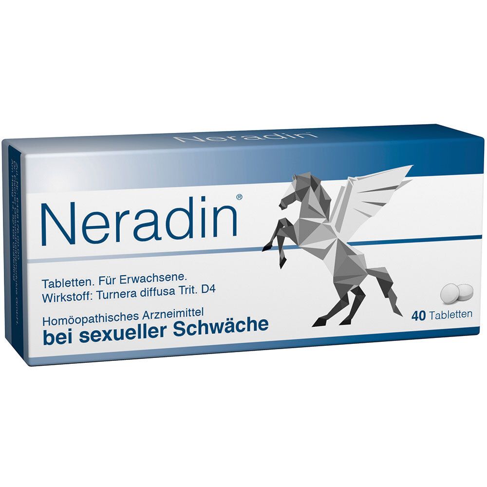 Neradin 40 META PreisvergleichMit dem Meta-Preisvergleich suchen Sie gleichzeitig bei den großen Preisvergleich Portalen!Jetzt live Suche nach neradin 40 starten! Neradin 40 KaufberatungNeradin 40 ist ein rezeptfreies homöopathisches Arzneimittel von PharmaSGP GmbH zur Behandlung von sexueller Schwäche, insbesondere Erektionsstörungen, mit dem Wirkstoff Turnera diffusa Trit. D4 (100 mg pro Tablette).[1][2][4] Es enthält Lactose, daher bei Laktoseintoleranz meiden; keine bekannten Neben- oder Wechselwirkungen, gut verträglich.[1][2][3] Wichtige Hinweise vor dem Kauf und zur Anwendung