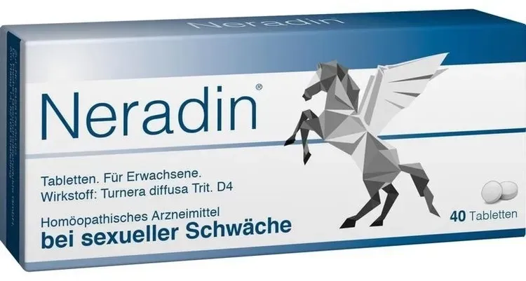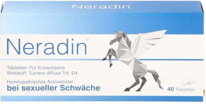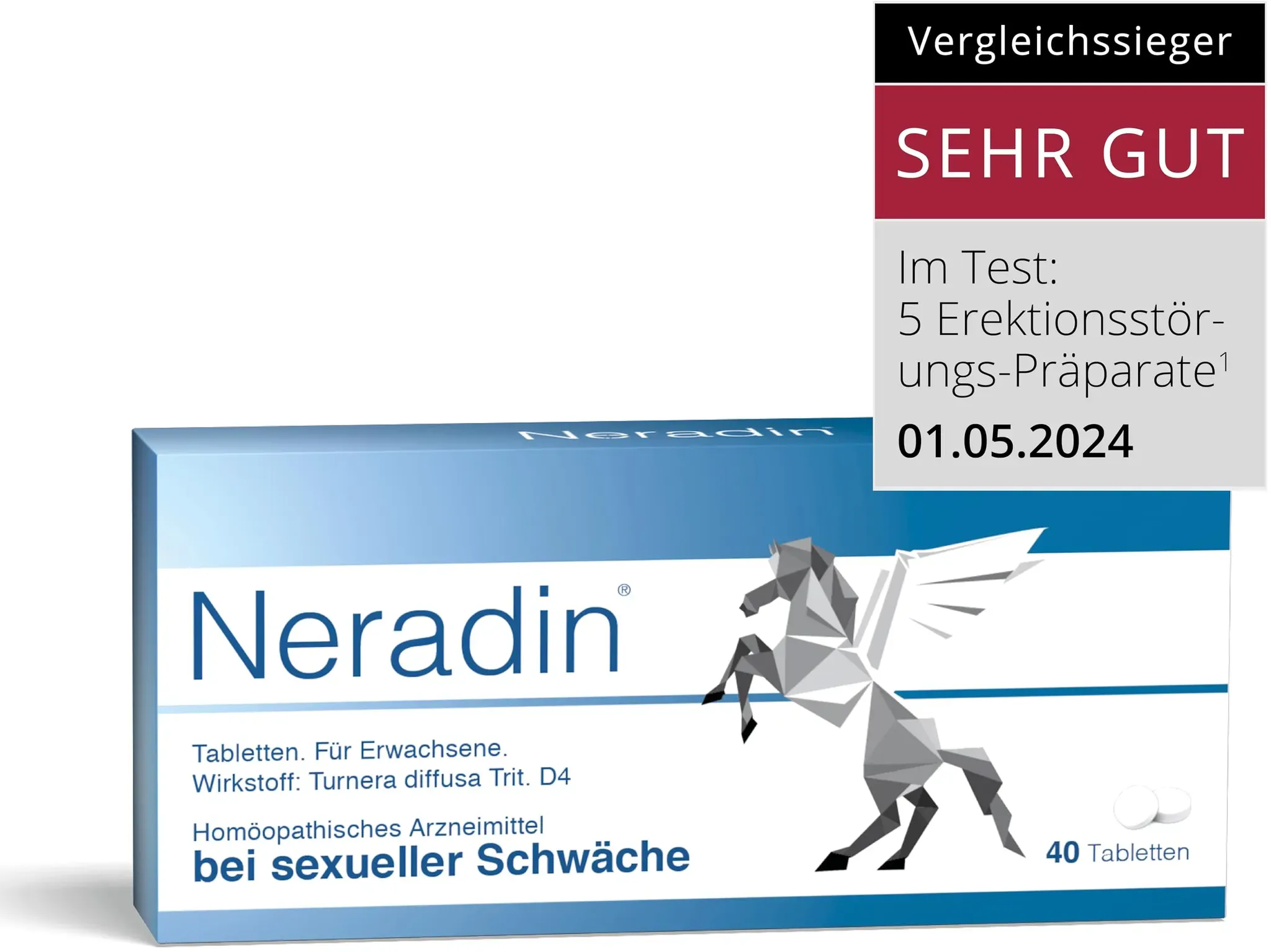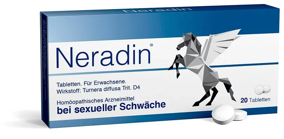 1,46 /St - Kategorie: Arzneimittel - PharmaSGP GmbH - GTIN:4150110243401 - PZN:11024340 - Neradin Tabletten - Hilfe bei sexueller Schwäche (z. B. Erektionsstörungen)Neradin ist ein rezeptfreies, homöopathisches Arzneimittel bei zum Beispiel Erektionsstörungen oder erektiler Dysfunktion. Da die Neradin Tabletten nicht auf eine kurzfristige, zeitlich begrenzte Wirkung nach der Einnahme ausgerichtet sind, kann das Liebesleben spontan statfinden - der Geschlechtsverkehr ist nicht an den Zeitpunkt der Einnahme gebunden.Neradin hat keine bekannten Nebenwirkungen (bspw. Sehstörungen oder Herzrhythmusstörungen). Auch Wechselwirkungen mit anderen Arzneimitteln sind nicht bekannt.Wirkstoff: Turnera diffusa Trit. D4 - 29,11 Euro bei medpex.de - gefunden von billiger.de Dieses Angebot für 20 Neradin Tabletten ist ebenfalls sehr preisgünstig und bietet eine gute Möglichkeit, das Produkt auszuprobieren. ![]() ![]() PharmaSGP GmbH Neradin Tabletten 20 St