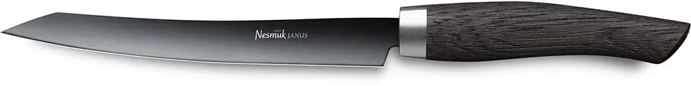 Kategorie: Küchenmesser - Nesmuk - GTIN:4260263692046 - Nesmuk Janus Slicer 160 Mooreiche Nesmuk JANUS unverkennbar an der schwarzen Klinge wird aus einem Hochleistungsstahl mit Niobanteil gefertigt und mit einer hochwertigen Diamond-Like-Carbon Beschichtung (DLC) veredelt, die die funktionalen Eigenschaften der Klinge optimiert. Die schmale, 160 mm lange Klinge des Slicers ist ideal zum Filetieren. Für alle Feinarbeiten, wie das Parieren von Fleisch, Filetieren von Fisch und Fleisch oder Filieren von Gemüse und Obst. Aber auch hervorragend geeignet, Speck, Schinken etc. hauchfein zu schneiden. Klinge: 160 mm, Niobstahl, 60 HRC, einseitiger Hohlschliff, DLC-Beschichtung Zwinge: Edelstahl matt gebürstet Inklusive: hochwertige mattschwarze Schatulle, Echtheitszertifikat Nesmuk entwickelt und fertigt Messer in höchstmöglicher Schärfe und setzt dabei auf Stahlsorten, Materialien und Technologien, die in der Schneidwarenindustrie noch nie zu... - 520,00 Euro bei grimm-daheim - gefunden von billiger.de Für alle, die einen längeren Slicer mit Mooreiche-Griff bevorzugen, bietet dieses Angebot ein gutes Preis-Leistungs-Verhältnis. ![]() ![]() Nesmuk JANUS Slicer 260mm Mooreiche