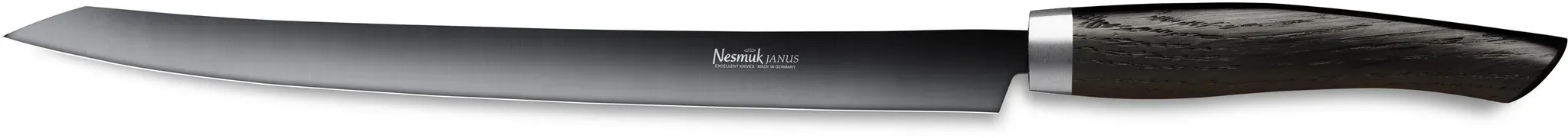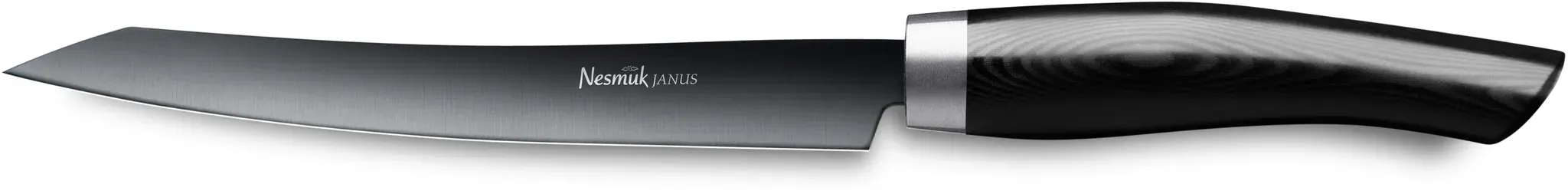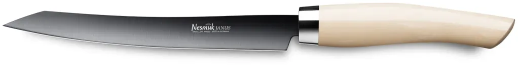 2 Händlerangebote bei billiger.de - Kategorie: Küchenmesser - Nesmuk - Der Nesmuk Janus Slicer ist ein 26 cm langes Küchenmesser für Präzisionsschnittarbeiten. Die Klinge besteht aus Niob-Hochleistungsstahl mit einer diamantähnlichen Kohlenstoffbeschichtung (DLC) für erhöhte Härte und Korrosionsbeständigkeit. Mit flachem Schliff und leichter Flexibilität ermöglicht sie saubere Schnitte durch Fleisch, Fisch und andere Lebensmittel. Der Griff aus massivem afrikanischem Grenadillholz ist nahtlos mit der Klinge verbunden für Langlebigkeit und komfortablen Halt. Ein matt gebürsteter Edelstahl-Bolzen sorgt für Ausgewogenheit und strukturelle Stabilität. Das Messer wird in einer mattschwarzen Box mit Echtheitszertifikat präsentiert. Durch die Kombination fortschrittlicher Materialien und ergonomischer Gestaltung erfüllt es die Ansprüche professioneller und privater Küchen an zuverlässige Schneidleistung. Das Farbkonzept in Braun und Schwarz spiegelt die natürlichen Holzelemente und die beschichtete Stahloberfläche wider. Modellnummer JSLG260. - GTIN:4260263701465 Der Nesmuk JANUS Slicer 160mm Juma Ivory ist eine auffällige Option für alle, die ein einzigartiges Design bevorzugen. ![]() ![]() Nesmuk JANUS Slicer 160mm Juma Ivory