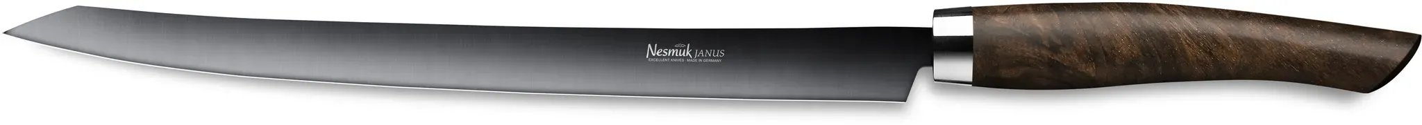 640,00 / 1 St - Kategorie: Küchenmesser - Nesmuk - GTIN:4260263701489 - FüR SCHINKEN UND GROSSE FISCH Der lange Nesmuk Slicer ist das perfekte Messer für die großen Aufgaben bei der Zubereitung. Mit einer Klingenlänge von 26 cm ist das halb-flexible Messer ultraleicht und bestens geeignet für lange und präzise .. - 640,00 Euro bei koempf24.de - gefunden von billiger.de Dieser 260mm Slicer mit Walnuss Maser ist eine luxuriöse Wahl für alle, die ein besonders schönes Holz bevorzugen. ![]() ![]() Nesmuk JANUS Slicer 260mm Walnuss Maser