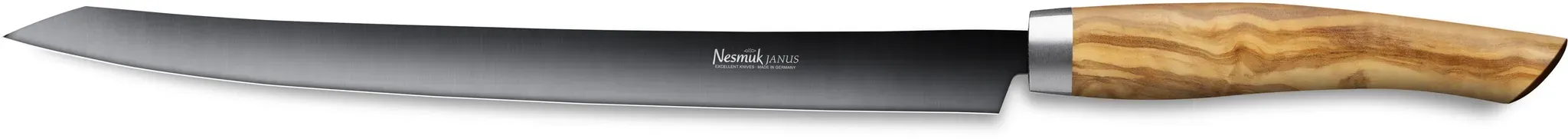 540,00 / 1 St - Kategorie: Küchenmesser - Nesmuk - GTIN:4260263701038 - FüR SCHINKEN UND GROSSE FISCH Der lange Nesmuk Slicer ist das perfekte Messer für die großen Aufgaben bei der Zubereitung. Mit einer Klingenlänge von 26 cm ist das halb-flexible Messer ultraleicht und bestens geeignet für lange und präzise .. - 540,00 Euro bei koempf24.de - gefunden von billiger.de Dieser 260mm Slicer mit Olivenholzgriff ist eine elegante Wahl für alle, die Wert auf natürliche Materialien legen. ![]() ![]() Nesmuk JANUS Slicer 260mm Olivenholz