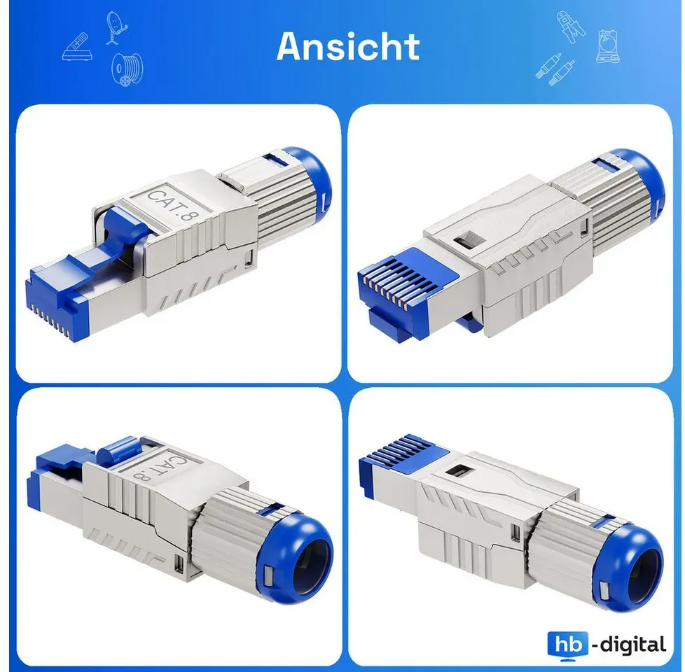 lieferbar-in 2-3 Werktagen bei dirHB-DIGITAL Netzwerkstecker Netzwerkstecker RJ45 CAT8 LAN Stecker, 50 Mikrozoll vergoldet auf der Kontaktoberfläche
