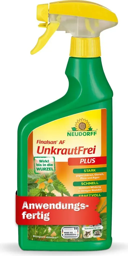 31,04 /l - Kategorie: Pflanzendünger - NEUDORFF - GTIN:4005240004968 - Kraftvoller Unkrautvernichter: Beseitigt schnell und wochenlang Unkräuter und Gräser, auch Problemunkräuter wie Ackerschachtelhalm, Giersch, Moos und Algen ohne Glyphosat!2fach-Wirkung: Natürliche Fettsäure zerstört Zellwände der Pflanzen für Sofortwirkung. Wachstumsregulator stoppt Zellteilung und verhindert wochenlang NeuaustriebWirkt bis in die Wurzel: Herbizid wirkt auf grüne Pflanzen bis in die Wurzel und ist auch bei niedrigen Temperaturen wirksam. Für Moosentferner empfehlen wir Finalsan RasenMoosfreiEinfache Anwendung: Entferner mit Wasser verdünnen, Unkraut besprühen, bis es braun wird und abstirbt. Besonders wirksam bei einer Unkrauthöhe von 5-10 cmUmweltfreundliches Unkrautmittel: Biologisch abbaubar, schonend für Bienen, Haustiere und Igel. Behandelte Flächen können nach dem Antrocknen sofort wieder benutzt werden Der Geruch von Finalsan UnkrautFrei Plus ist wirkstoffspezifisch und nach kurzer Zeit nicht mehr wahrnehmbar. **Wirkungsspektrum:** Finalsan UnkrautFrei Plus wirkt gegen viele wichtige Unkräuter wie z.B. Löwenzahn, Wegerich-Arten, Gräser, Giersch, Ackerschachtelhalm, Vogelmiere, Brennnessel und Distel. Die Wirkung ist bereits nach einem Tag sichtbar. Außerdem werden Moose und Algen bekämpft. Das Mittel besitzt keine nachhaltige Wirkung. **Nicht zur Beseitigung von Unkräutern und Moos in Rasenflächen geeignet, da alle grünen Pflanzenteile abgetötet werden.** **Neupflanzung nach ... Für 15.97 Euro erhalten Sie eine anwendungsfertige 750 ml Flasche, die für 25 m² ausreicht und somit für kleinere Gartenbereiche geeignet ist. ![]() ![]() Neudorff Finalsan AF UnkrautFrei Plus 750 ml für 25 m2 schnell wirkend
