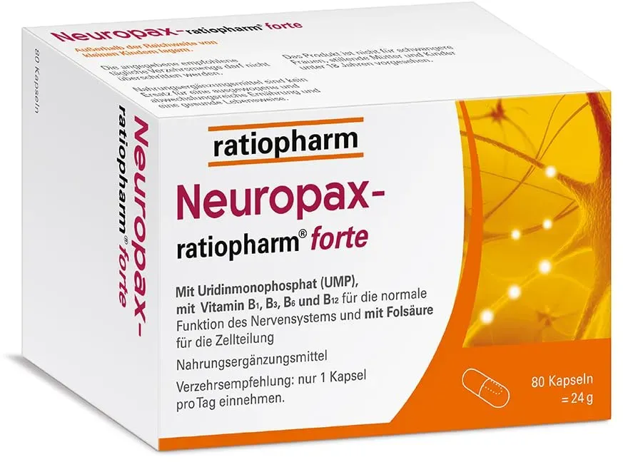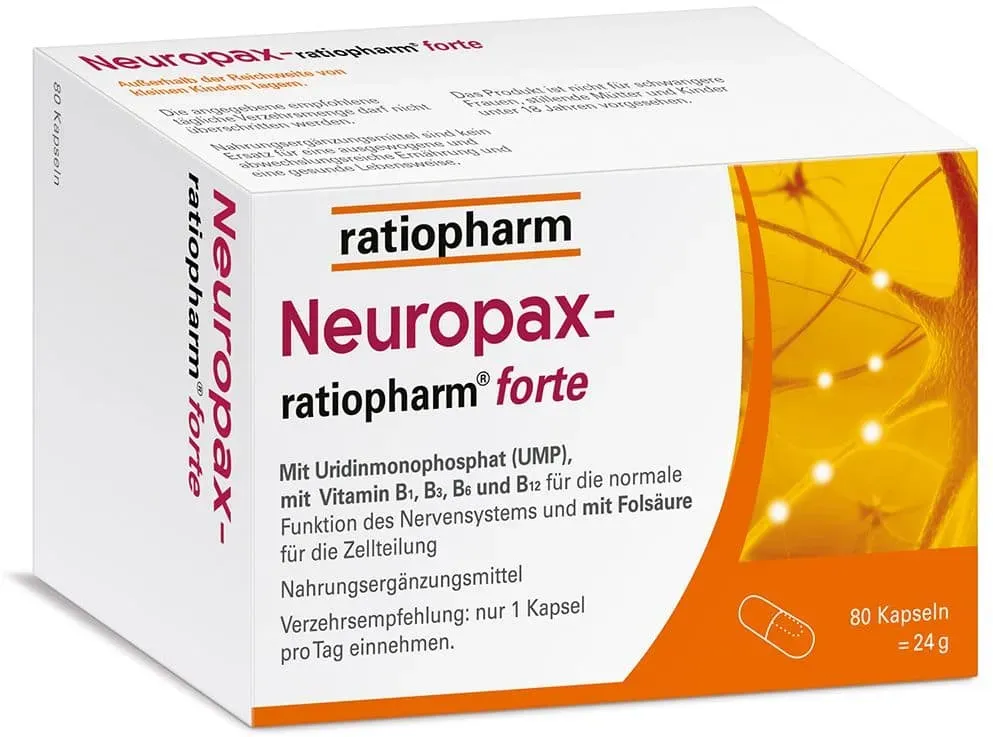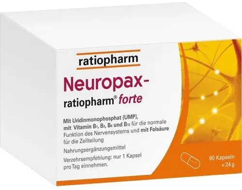 Ratiopharm Gmbh - EAN: 4150193865804 - Nahrungsergänzungsmittel sind kein Ersatz für eine ausgewogene und abwechslungsreiche Ernährung und eine gesunde Lebensweise. Neuropax-ratiopharm forte Neuropax-ratiopharm forte ist ein Nahrungsergänzungsmittel mit Uridinmonophosphat (UMP) und 5... - bei shop-apotheke.com - aus Yadore Produktdaten ![]() ![]() NEUROPAX-ratiopharm forte Kapseln 80 St