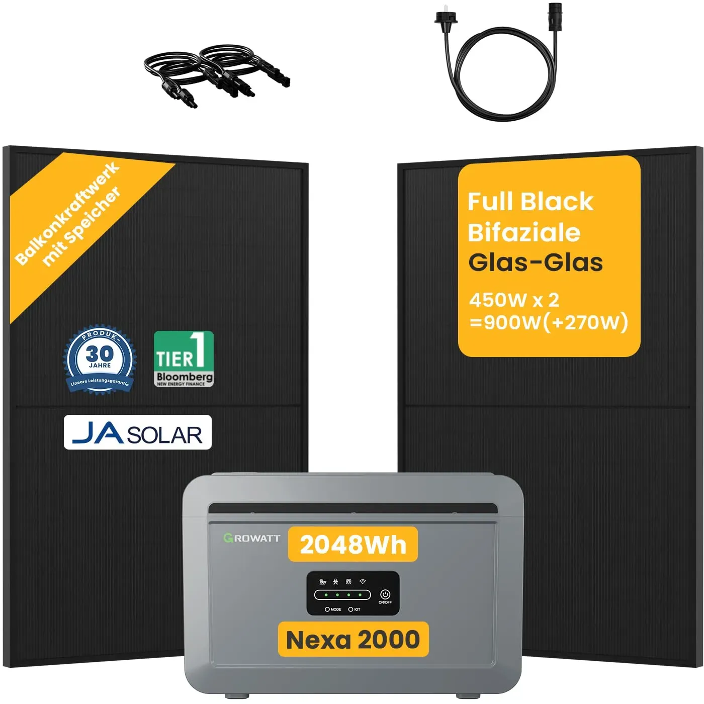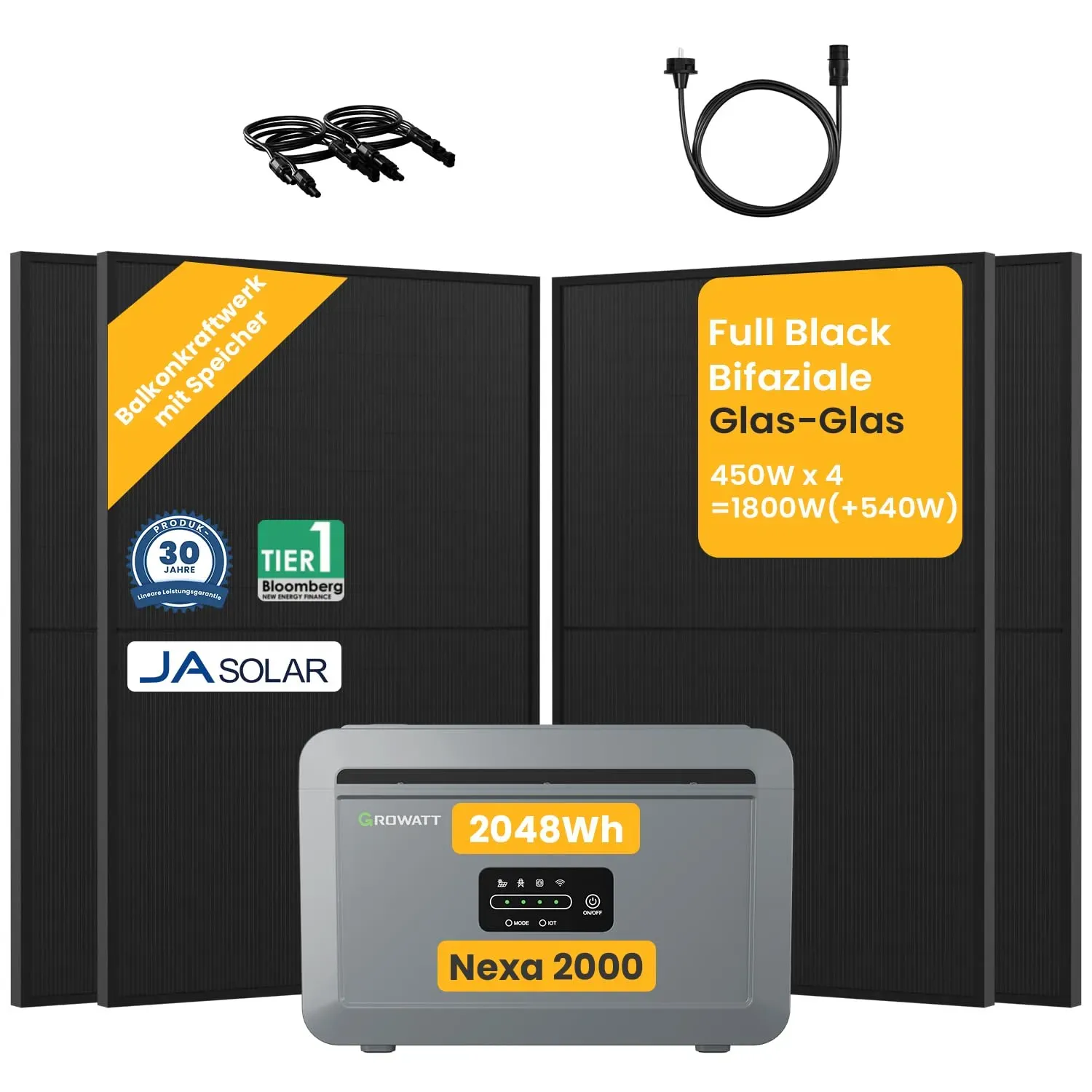 21 Händlerangebote bei billiger.de - Kategorie: Stromspeicher - powerness - Growatt NEXA 2000 Solarspeicher:Maximale PV-Eingangsleistung: 2600W4 unabhängige MPPT-Kanäle: Maximiert den Ertrag selbst bei wechselnden LichtverhältnissenNetzgekoppelter AC-Ausgang: 800W NennleistungIntegrierte Off-Grid-Funktion: 800W unabhängige Notstromversorgung.Leistungsstarker LiFePO4-Akku für maximale SpeicherflexibilitätSmarte Steuerung & einfache BedienungWiFi & Bluetooth-Unterstützung: Einfache Integration in dein Smart-Home-SystemRobustes Design & höchste SicherheitsstandardsÂJA Solar 500W Solarmodulen Technische DatenMax- empfohlene DC Leistung: 500 WpModulwirkungsgrad: 22.6 %Anzahl Zellen: 120Zellentyp: monokristalinKabellänge: 1200 mm (+) / 1200 mm (-)Stecksystem: MC4-EVO2AModulabmessungen: 1953x1134x30mmGewicht: 27.3 kgDruckbelastung Vorderseite: 5400 paDruckbelastung Rückseite: 2400 paÂWarum Powerness wählenBei Kontakt mit unserem technischen Support (online oder telefonisch unter +49 1625688967 / +49 1525 7918463) nennen Sie bitte Ihre Bestellnummer und die Seriennummer der Geräte (Die Seriennummer finden Sie auf dem Gerätelabel.)€“ so ermöglichen Sie eine schnellere Lösung. Kunden Telefonservice Telefonisch erreichen Sie uns von Mo. - Fr. von 10 Uhr bis 14 Uhr.Â0% MwSt. ausgewiesen.(ohne Mwst.)Wichtig: In diesem wird davon ausgegangen, dass Sie gemäß Gemäß § 12 Abs.-Satz von 0% zu erwerben. Ab dem 1.-frei gemäß § 12 Abs. - GTIN:4262444689777 Ein preiswertes Balkonkraftwerk-Set mit 1800W bifazialen Solarmodulen und dem NEXA 2000 Speicher. ![]() ![]() 1800W Balkonkraftwerk - Bifazial mit eBay 2048Wh Speicher Growatt NEXA 2000 All-in-one