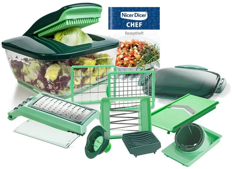 Auf Lager Versand durch AmazonGenius Nicer Dicer Chef (18-teilig) Gemseschneider mit Glasschssel & Tomaten-Gemse-Schneider aus dem TV - Zerkleinerer Obstschneider Zwiebelschneider Spiralschneider, Mintgrn