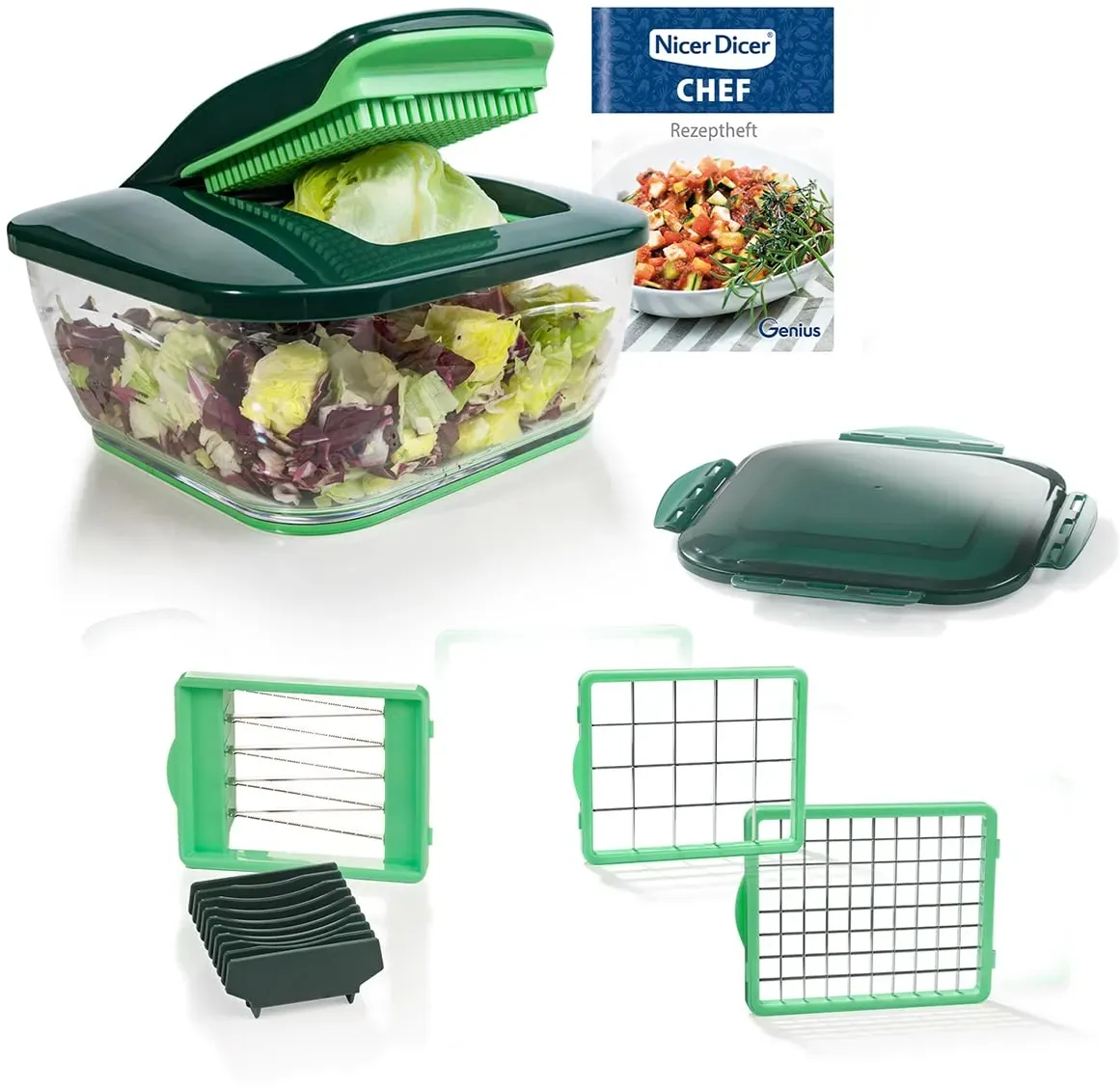Zustand: Neu - Gemsehobel - Genius - A27175 - EAN: 4023012271752 - Der Allrounder unter den Lebensmittelschneidern. Der Nicer Dicer Chef Professional ist 37 % grer als sein Vorgnger 8-eckiger Auffangbehlter mit Fassungsvermgen von 5.200 ml inkl. Frischhaltedeckel Egal ob Sie Mahlzeiten vorbereiten, einen Salat machen oder einen schnellen Auflauf zaubern wollen. Mit dem Nicer Dicer Chef Professional haben Sie alles in einem. Messereinstze, Schneide-Stempel, Hobel und Reib-Einstze mit Schneidguthalter sowie Juliettieinstze. Egal wie Sie Ihre Lebensmittel schneiden wollen, mit dem Nicer Dicer Chef Professional geht das schnell und einfach. Extra scharfe Edelstahl-Klingen in feinster G-NOX-Qualitt. Fr das bisschen extra Sicherheit inklusive Schutzabedeckung - Verkufer: Genius GmbH im amazon.de Marketplace Das 23-teilige Professional Set für 42.15 Euro bietet eine erweiterte Funktionalität zu einem attraktiven Preis. ![]() ![]() Genius Nicer Dicer Chef Professional Set 23-teilig grün