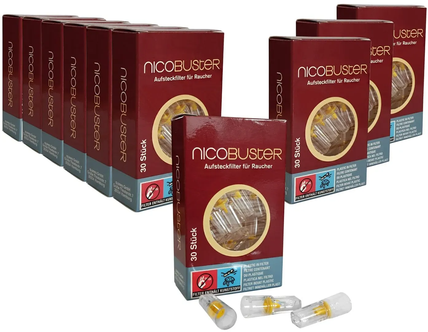 Zustand: Neu - 0,10 € / stück - Elektronische Zigaretten E-Zigaretten - Nicobuster - 19100 - EAN: 4251582709256 - REDUZIERT SCHADSTOFFE: Der innovative Nicobuster-Filter reduziert Teer, Nikotin und weitere Schadstoffe im Zigarettenrauch. KEIN GESCHMACKSVERLUST: Die Mehrweg-Filter sind aus medizinischen Rohstoffen gefertigt - geeignet für die Lebensmittelindustrie - und verändern den Geschmack der Zigarette nicht. ANWENDUNG: Mit einem Durchmesser von 8mm ist der Aufsteckfilter für alle herkömmlichen Zigaretten geeignet. KEINE VERFÄRBUNGEN: Der Filter-Aufsatz verhindert den direkten Kontakt mit der Zigarette, wodurch Verfärbungen und Geruch an den Fingern reduziert wird. DAS ORIGINAL: Der original Nicobuster-Filter wird seit 1999 erfolgreich verkauft und überzeugt Kunden von Deutschland bis nach Australien. - Verkäufer: quaneo GmbH im amazon.de Marketplace Dieses Angebot bietet eine gute Balance zwischen Preis und Menge für regelmäÃ?ige Nutzer. ![]() ![]() Nicobuster Zigarettenfilter - Filter Aufsatz - 180 Stk - Aufsteckfilter für Raucher - reduziert Schadstoffe, Teer, Nikotin - kein Geschmacksverlust - 6 x 30 Filter