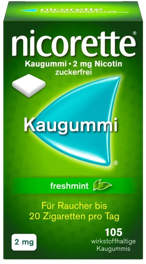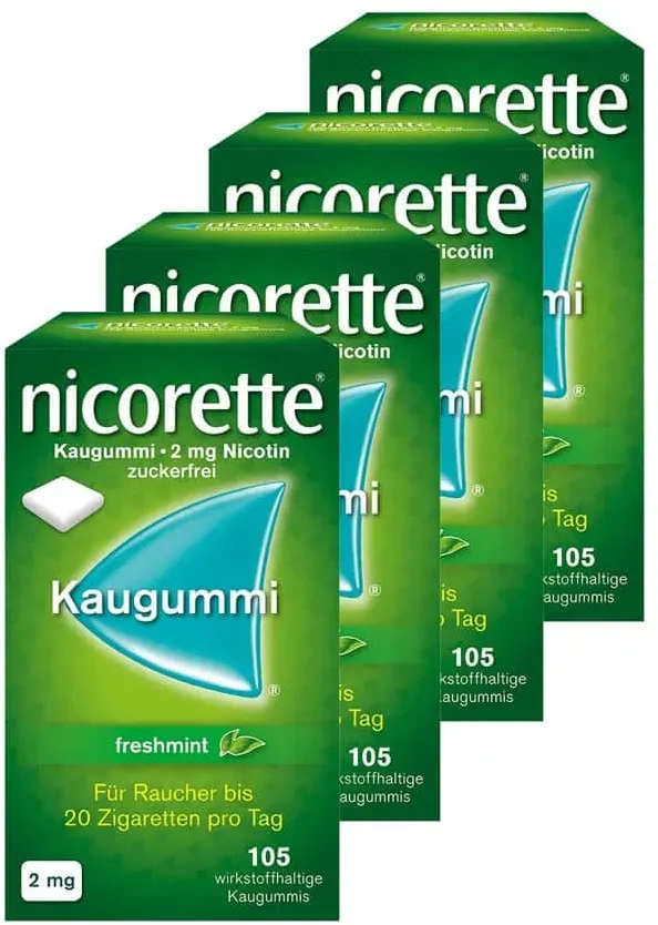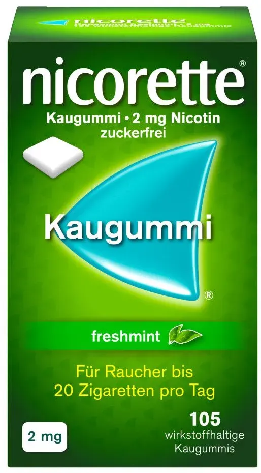 0.21 eur / 1st - 'Arzneimittel-Gesundheit Raucherentwöhnung' Vitamine & Ergänzungen - EAN:4150800428255 - nicorette R Kaugummi lindert Entzugssymptome wie Rauchverlangen, innere Unruhe und gesteigerten AppetitLindert Rauchverlangen - klinisch belegtMit 2 mg Nikotin für Raucher von bis zu 20 Zigaretten pro TagZuckerfrei und mit frischem MinzgeschmackGeschmackliche Alternativen: freshfruit und whitemintReicht für etwa 3 Tage bei Anwendung von 10 Kaugummis täglich Das nicorette R Kaugummi 2 mg freshmint unterstützt bei der Raucherentwöhnung. Das enthaltene therapeutische Nikotin, das durch Kauen freigesetzt wird, reduziert das Rauchverlangen auf dem Weg zum Nichtraucher. Darüber hinaus lindert es weitere Entzugserscheinungen, wie beispielsweise innere Unruhe und gesteigerten Appetit. Das zuckerfreie Kaugummi ist mit einem angenehmen Minzgeschmack versetzt, der für ein frisches Mundgefühl sorgt. Für geschmackliche Abwechslung gibt es auch die Geschmacksrichtungen freshfruit und whitemint. Bei starkem Rauchverlangen können die Kaugummis mit dem nicorette R Pflaster kombiniert werden. Das Pflaster gibt über 16 Stunden hinweg Nikotin ab, während das 2 mg Kaugummi für zusätzliche Unterstützung in besonders schwierigen Situationen genutzt werden kann. Anwendung:nicorette R Kaugummi: Die richtige Anwendung Die Nikotinersatztherapie mit dem nicorette R Kaugummi 2 mg freshmint erfolgt durch das Kauen des Produkts: So wird das enthaltene Nikotin freigesetzt, das anschließend über die ... Dieses 4er-Pack auf Amazon bietet eine große Menge zu einem guten Gesamtpreis, perfekt für eine langfristige Raucherentwöhnung. ![]() ![]() Nicorette 2 mg Nikotinkaugummi freshmint zur Rauchentwöhnung 4 x 105 Stück