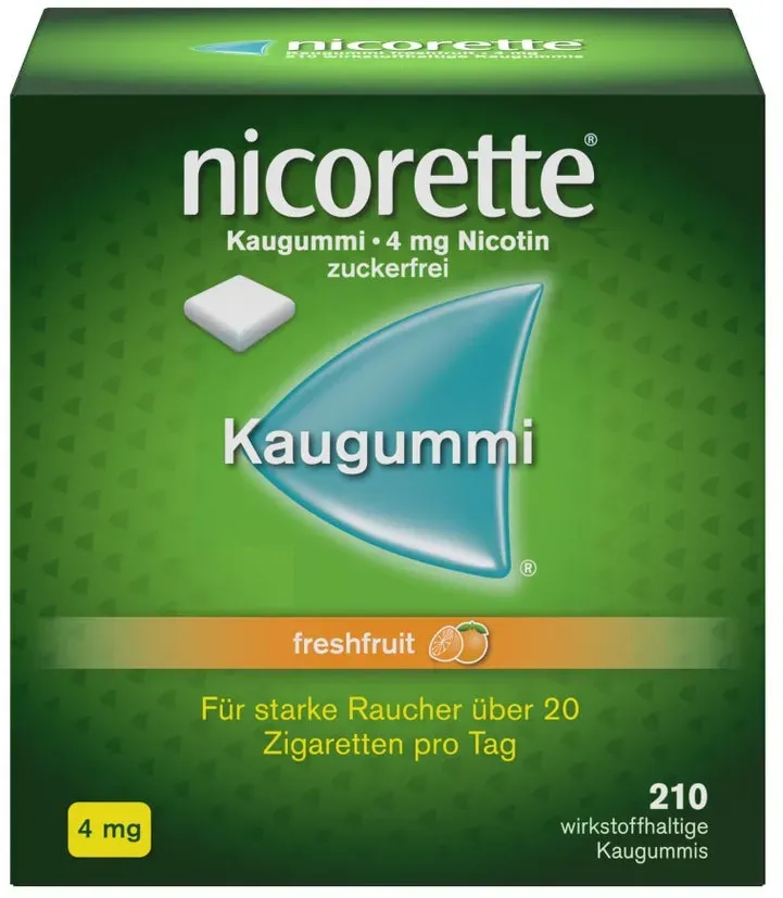 0,20 /St - Kategorie: Arzneimittel - kenvue - GTIN:4150183798044 - PZN:18379804 - nicorette Kaugummi lindert Entzugssymptome wie Rauchverlangen, innere Unruhe und gesteigerten Appetitlindert Rauchverlangen - klinisch belegtzuckerfreie Nikotinkaugummis mit Fruchtgeschmack für die RaucherentwöhnungMit 4 mg Nikotin für Raucher von mehr als 20 Zigaretten pro TagReicht für etwa 3 Tage bei Verwendung von 10 Kaugummis pro TagErhältlich auch in freshmint und whitemint Geschmack Auf dem Weg zum Nichtraucher:Die nicorette Kaugummis 4 mg freshfruit unterstützen bei der Raucherentwöhnung. Das Kauen der Kaugummis setzt den Wirkstoff Nikotin frei, wodurch sich Entzugserscheinungen auf dem Weg zum Nichtraucher lindern lassen. Dazu zählen beispielsweise Rauchverlangen, innere Unruhe und gesteigerter Appetit. Die Packung mit 30 Kaugummis reicht bei der Nutzung von 10 Kaugummis täglich für etwa 3 Tage. Anwendung:nicorette Kaugummi 4 mg freshfruit und die richtige Anwendung Jedes nicorette Kaugummi 4 mg freshfruit enthält 4 mg Nikotin, das durch das aktive Kauen freigesetzt wird. Der Wirkstoff gelangt über die Mundschleimhaut in den Körper, wodurch sich der Nikotinspiegel im Blut erhöht. Dies mindert das Rauchverlangen. Bei der Nikotinersatztherapie mit den nicorette Kaugummis ist folgendes Kauschema wichtig: Zunächst etwa 1 Minute lang kauen, bis ein intensiver Geschmack auffällt. Anschließend mit dem Kauen pausieren und das Kaugummi in die Wange schieben, bis der Geschmack nachlässt.Dann ... Dieses Angebot für 210 Stück Nicorette 4mg freshmint Kaugummi ist das günstigste für die Geschmacksrichtung freshmint. ![]() ![]() kenvue nicorette Kaugummi 4mg freshmint 210 St