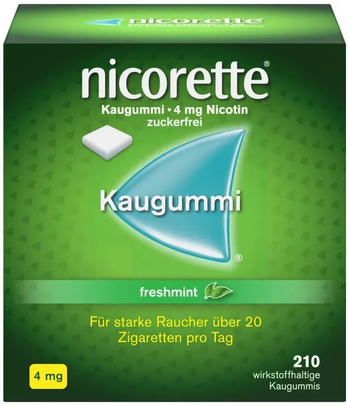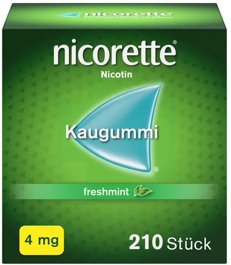 EAN: 4150183798105 - Nicorette Kaugummi freshmint mit 4 mg Nikotin zur Raucherentwöhnung Gemeinsam durchhalten! Mit deinem Willen und nicorette Kaugummi mit dem Rauchen aufhören! Das nicorette Kaugummi freshmint unterstützt auf dem Weg in die Rauchfreiheit. Das aktive Kauen des Nikotinkaugummis setzt Nikotin frei, welches über die Mundschleimhaut in die Blutbahn gelangt und den Nikotinspiegel erhöht. Dadurch wird nicht nur Rauchverlangen, sondern auch typische Entzugserscheinungen wie innere Unruhe oder gesteigerter Appetit gelindert. Außerdem kann das aktive Kauen vom Rauchverlangen ablenken. Die nicorette Kaugummis sind nicht nur zuckerfrei, sondern haben auch einen frischen Minzgeschmack. Mit den enthaltenen 4 mg Nikotin eignen sich diese Kaugummis für Personen, die bislang mehr als 20 Zigaretten pro Tag rauchen. Wenn bis zu 20 Zigaretten geraucht werden, sollten die niedriger dosierten Kaugummis mit 2 mg Nikotin verwendet werden. Die nicorette Kaugummis sind auch in den Geschmacksrichtungen freshfruit und whitemint erhältlich. Unterstützen mit 4 mg Nikotin bei der Raucherentwöhnung Für Personen, die mehr als 20 Zigaretten pro Tag rauchen Lindert Symptome der Raucherentwöhnung 105 Kaugummis ersetzen bis zu 105 Zigaretten Aktives Kauen kann vom Rauchverlangen ablenken Frischer Geschmack von Minze erfrischt Mund und Rachen Auch in Geschmacksrichtungen freshfruit und whitemint erhältlich Zuckerfrei und mit 4 mg Nikotin Pflichtangaben: Nicorette Kaugummi 4 mg freshmint . ... Dieses Angebot für 210 Stück Nicorette 4mg freshmint Kaugummi ist ebenfalls sehr attraktiv im Preis-Leistungs-Verhältnis. ![]() ![]() kenvue NICORETTE Kaugummi 4 mg freshmint 210 St