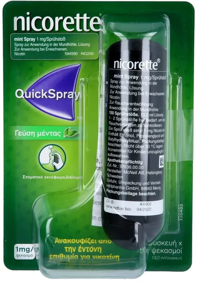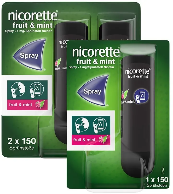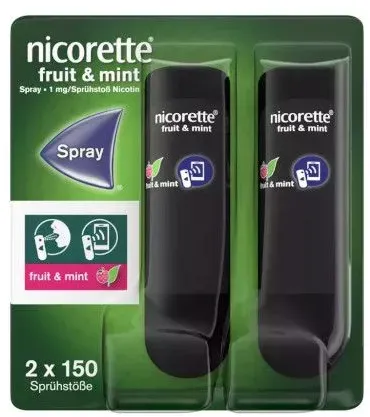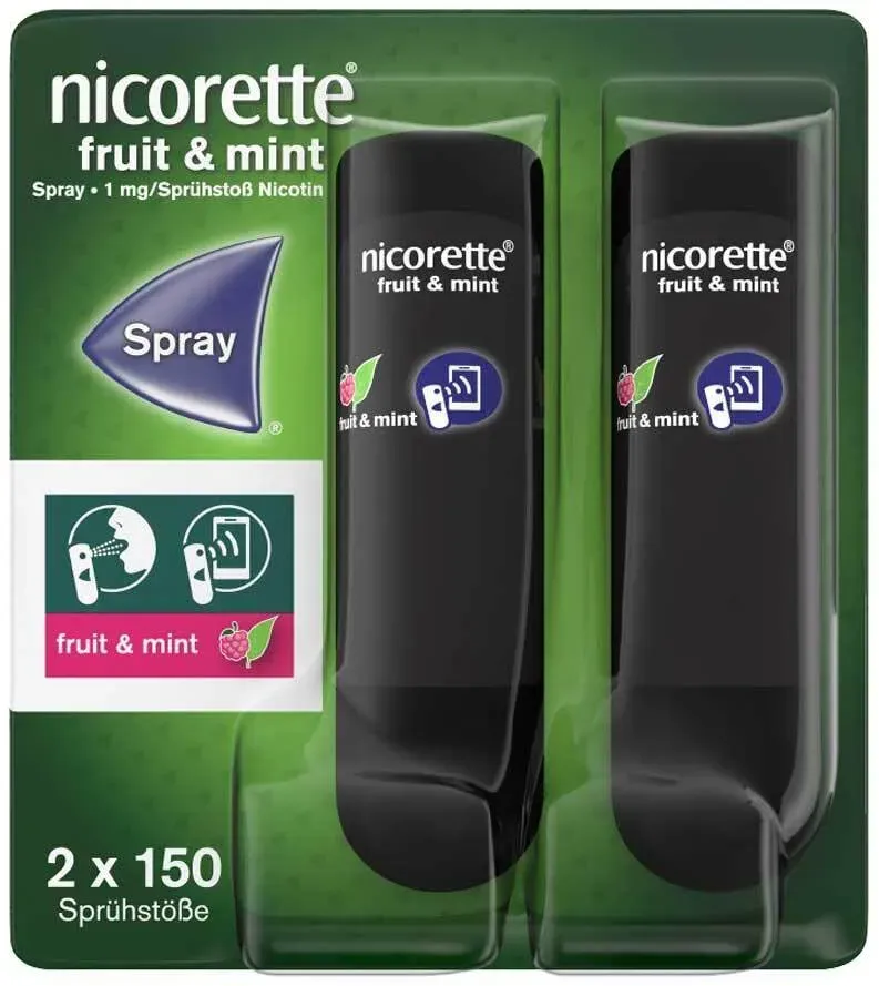 Verfügbarkeit: 2-4 Werktage - 22,99 €/Stück - Kategorie: Rauchentwöhnung - Nicorette - GTIN:4150166794599 - PZN:16679459 - Nicorette Mint Spray 1 mg/Sprühstoß 1 Stück - von Kohlpharma GmbH - Kategorie: Sonstiges - versandkostenfrei - 22,99 Euro bei healthii - gefunden von billiger.de Dieses 2er-Pack des Fruit & Mint Sprays für 34.60 Euro ist eine gute Option, um Vorrat zu haben und dabei etwas zu sparen. ![]() ![]() Kenvue NICORETTE Fruit & Mint Spray 1 mg/Sprühstoß NFC 2 St