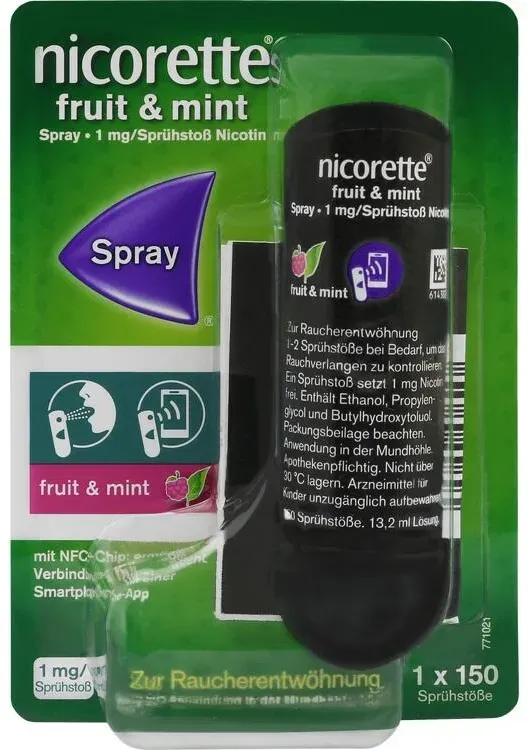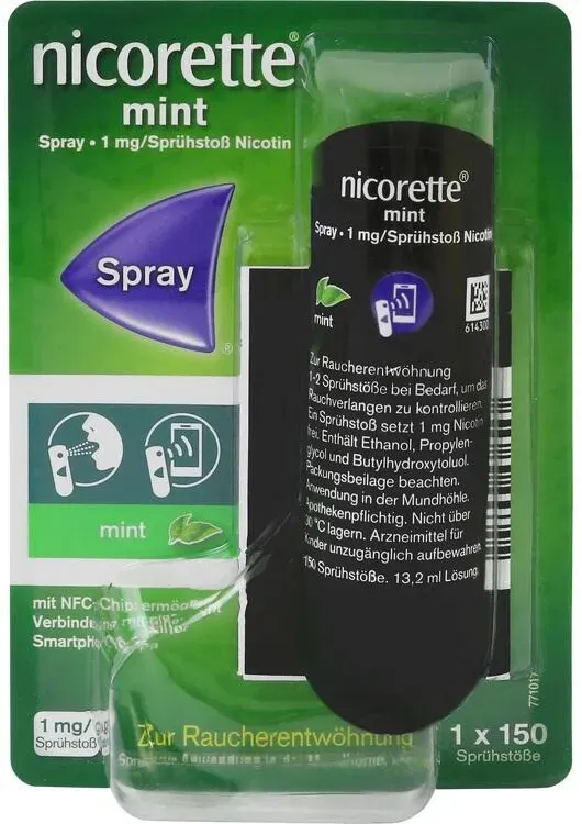 Verfügbarkeit: Lieferbar in 1-2 Werktagen - 17,58 €/St - Kategorie: Arzneimittel - Nicorette - GTIN:4150166758003 - PZN:16675800 - Nicotin Nicorette Mint Spray €“ Unterstützung bei der RauchentwöhnungAngewendet wird das Nicorette Mint Spray in der Mundhöhle als Nikotinersatzprodukt, um Erwachsenen bei der Rauchentwöhnung zu helfen. Das Spray bietet durch einen kontrollierten Nikotinstoß schnelle Hilfe bei Rauchverlangen und Symptomen des Nikotinentzugs.Anwendung und DosierungDie Bedienung des Nicorette Sprays ist denkbar einfach. Je nach individuellem Bedarf wird ein Sprühstoß in den Mund gegeben, um das Verlangen nach einer Zigarette zu minimieren. Die genaue Dosierung ist der Packungsbeilage zu entnehmen und sollte strikt eingehalten werden. Regelmäßige Anwendung ist entscheidend für eine allmähliche Verminderung des Rauchverlangens.Wichtige HinweiseVor Beginn der Anwendung ist es wichtig, die gesamte Packungsbeilage gründlich zu lesen. Bei Auftreten unerwünschter Nebenwirkungen sollte ärztliche oder pharmazeutische Beratung in Anspruch genommen werden.Nicotin zur Unterstützung bei der RauchentwöhnungHilfe bei der Kontrolle von EntzugssymptomenGeeignet zur Anwendung in der MundhöhleDosierungshinweise in der Packungsbeilage beachten - 35,16 Euro bei medpex.de - gefunden von billiger.de Dieses 2er-Pack des Fruit & Mint Sprays für 48.05 Euro ist eine gute Wahl für alle, die den fruchtigen Minzgeschmack bevorzugen und einen kleinen Vorrat wünschen. ![]() ![]() NICORETTE Fruit & Mint Spray 1 mg/Sprühstoß NFC 2 St