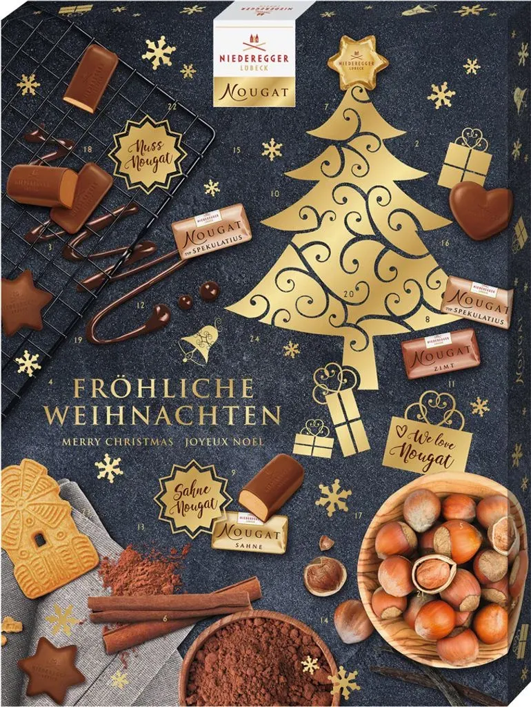 Zustand: Neu - Adventskalender Adventskalender mit Speisen & Getränken - Niederegger J.G. Niederegger GmbH & Co.KG, Zeißstraße 1-7, 23560 Lübeck - - EAN: 4000161730934 - Perfektes Geschenk für alle Nougat-Liebhaber Hinter jeden Türchen feinste Nougat-Spezialitäten So versüßt man sich das Warten auf das Fest - Verkäufer: HL Kauf im amazon.de Marketplace Das 3er Pack des klassischen Nougat-Kalenders ist perfekt für GroÃ?familien oder als Vorrat für echte Nougat-Fans. ![]() ![]() Niederegger Adventskalender Nougat, 3er Pack (3 x 500 g)