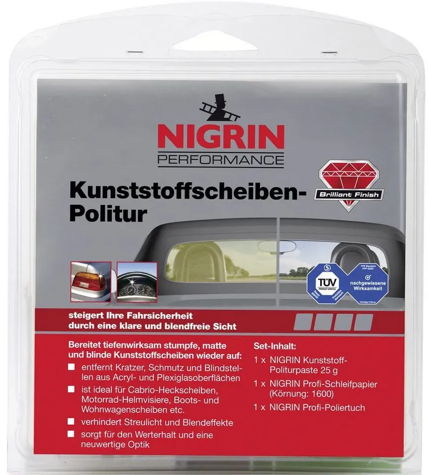 Nigrin performance kunststoffscheiben-politur META PreisvergleichMit dem Meta-Preisvergleich suchen Sie gleichzeitig bei den großen Preisvergleich Portalen!Jetzt live Suche nach nigrin performance kunststoffscheiben-politur starten! Nigrin performance kunststoffscheiben-politur KaufberatungProduktübersicht: Nigrin Performance Kunststoffscheiben-PoliturDie Nigrin Performance Kunststoffscheiben-Politur ist ein spezielles Polierset zur Aufbereitung von Kunststoffscheiben, insbesondere aus unbeschichtetem Acryl und Plexiglas. Typische Anwendungsbereiche sind Cabrio-Heckscheiben, Motorrad-Helmvisiere, Wohnwagen- und Bootsscheiben, aber auch Scheinwerfer, Cockpit- und Uhrenscheiben[1][3][4]. Das Set enthält eine Politurpaste (25 g), Schleifpapier (Körnung 1600) und ein Profi-Poliertuch[1][2]. Ziel ist die Entfernung von Kratzern, Mattierungen, Blindstellen und Witterungsspuren, um die Sicht zu verbessern und den Werterhalt zu sichern[1][3][8]. Was muss ich beachten?