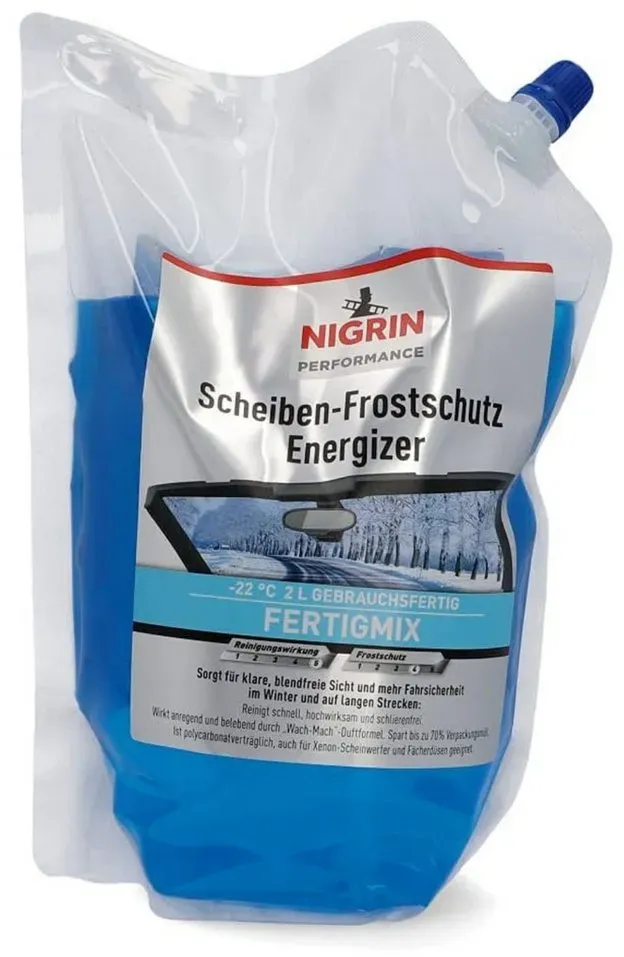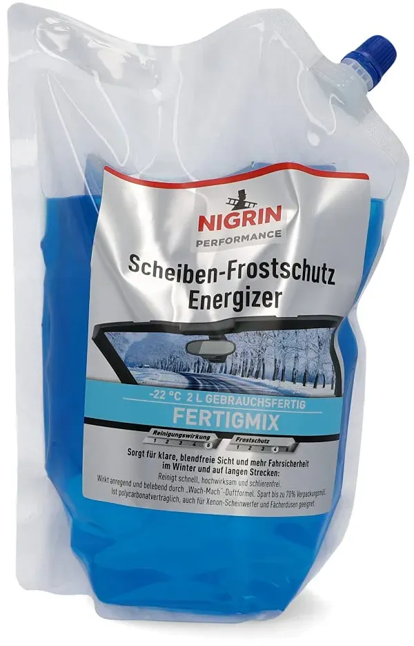 11 Händlerangebote bei billiger.de - Kategorie: Autoreinigung & Pflege - Nigrin - EFFEKTIV: Der Scheibenreiniger Fertigmix ist wirksam bis -18 C BELEBEND: Die 'Wach-Mach' Duftformel stärkt die Aufmerksamkeit und unterstützt die Konzentration DURCHBLICK: Der NIGRIN Performance Scheiben-Frostschutz Energizer sorgt für eine klare und blendfreie Sicht GRüNDLICH: Der Scheiben Frostschutz reinigt schlierenfrei Front- und Heckscheiben GUT VERTRäGLICH: Das NIGRIN Scheiben-Frostschutz Energizer ist gut verträglich mit Kunststoffen wie Polycarbonat. Auch für XENON-Scheinwerfer und Kunststoffdiffusoren ist dieses Scheibenfrostschutzmittel gut geeignet. - GTIN:4008153046766 Ein praktischer 2-Liter-Beutel Fertigmix bis -22°C, der leicht zu lagern und zu entsorgen ist. ![]() ![]() Nigrin Scheiben-Frostschutz 22 c, 2 Liter/ Beutel