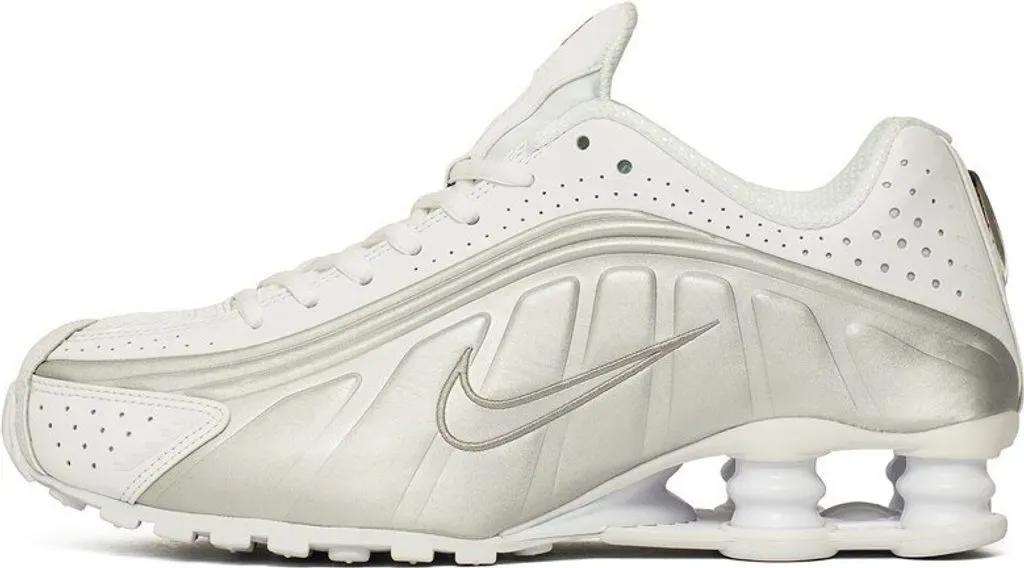 5 Händlerangebote bei billiger.de - Kategorie: Sneaker - Nike - Als der Shox R4 im Jahr 2000 auf den Markt kam, revolutionierte er die Form traditioneller Sneaker dank seines futuristischen Looks. Er kombiniert seidenweiches, synthetisches Obermaterial mit fließenden Riffelungen und Laserperforationen zu einem Design, das an Raumanzüge und andere Astronautenausrüstungen erinnert. Vier Kompressionssäulen heben die Ferse an und bieten dadurch eine stabile Struktur und gute Sprungkraft. Glattes weißes Kunstleder mit Akzenten in Metallic Silver und Max Orange sorgen für einen weiteren modernen Touch. Mit dem R4 bist du deiner Zeit voraus. SKU: AR3565-101 Nutzertyp: DamenZweck: UniversalSaison: GanzjährigForm: HalbschuheFarbe: Weiß-SilberSchaftstoff: Textil,KunststoffArt des Inneren: Textil - GTIN:0192499227355 Ein sehr preiswertes Angebot für den Nike Shox R4 in einer Standardgröße, perfekt für preisbewusste Käuferinnen. ![]() ![]() Nike Shox R4 Damen White/Metallic Silver/Max Orange/White 38