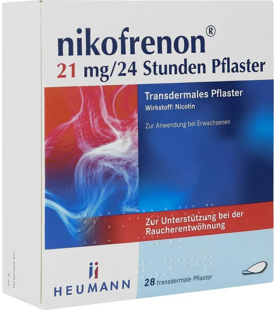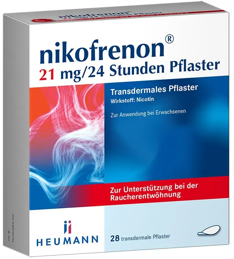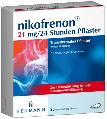 1,03 /St - Kategorie: Rauchentwöhnung - Heumann - GTIN:4150159932830 - PZN:15993283 - nikofrenon 21 mg/24 Stunden Pflaster 28 St - rezeptfrei - von HEUMANN PHARMA GmbH & Co. Generica KG - Pflaster transdermal - 28 St - 28,81 Euro bei DocMorris Apotheke - gefunden von billiger.de ![]() ![]() Heumann nikofrenon 21 mg/24 Stunden Pflaster 28 St