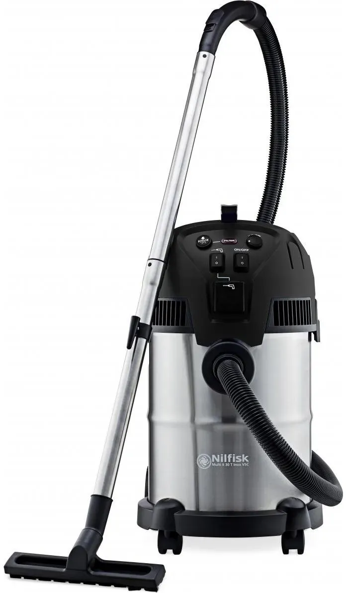 Nilfisk - EAN: 5715492276479 - . Motor, Pmax.: 1400 W . Vacuum: 210 mbar . Airflow: 2500 l/min . Container volume: 30 liters - robust steel container . 5 m power cable - 8 meter reach . Socket for power tools with automatic on/off for the vacuum cleaner . Delayed shutdown when using power tools . Push&Clean filter cleaning system - prevents filter clogging . Filter cleaning indicator . Suction power regulation . User-friendly control panel . Blowing function . Strong snap locks . Two swivel wheels and two fixed wheels . Smart click system for quick parking of extension tube with nozzle . Hook for practical hose storage . Holders for accessories, power cord, and hose - bei proshop.de - aus Yadore Produktdaten Galaxus.de hat den multi II 30 T inox VSC Basic gelistet, der eine zuverlässige Wahl für grundlegende Reinigungsaufgaben ist. ![]() ![]() Nilfisk multi II 30 T inox VSC Basic (Nass-Trockensauger) (1276260)