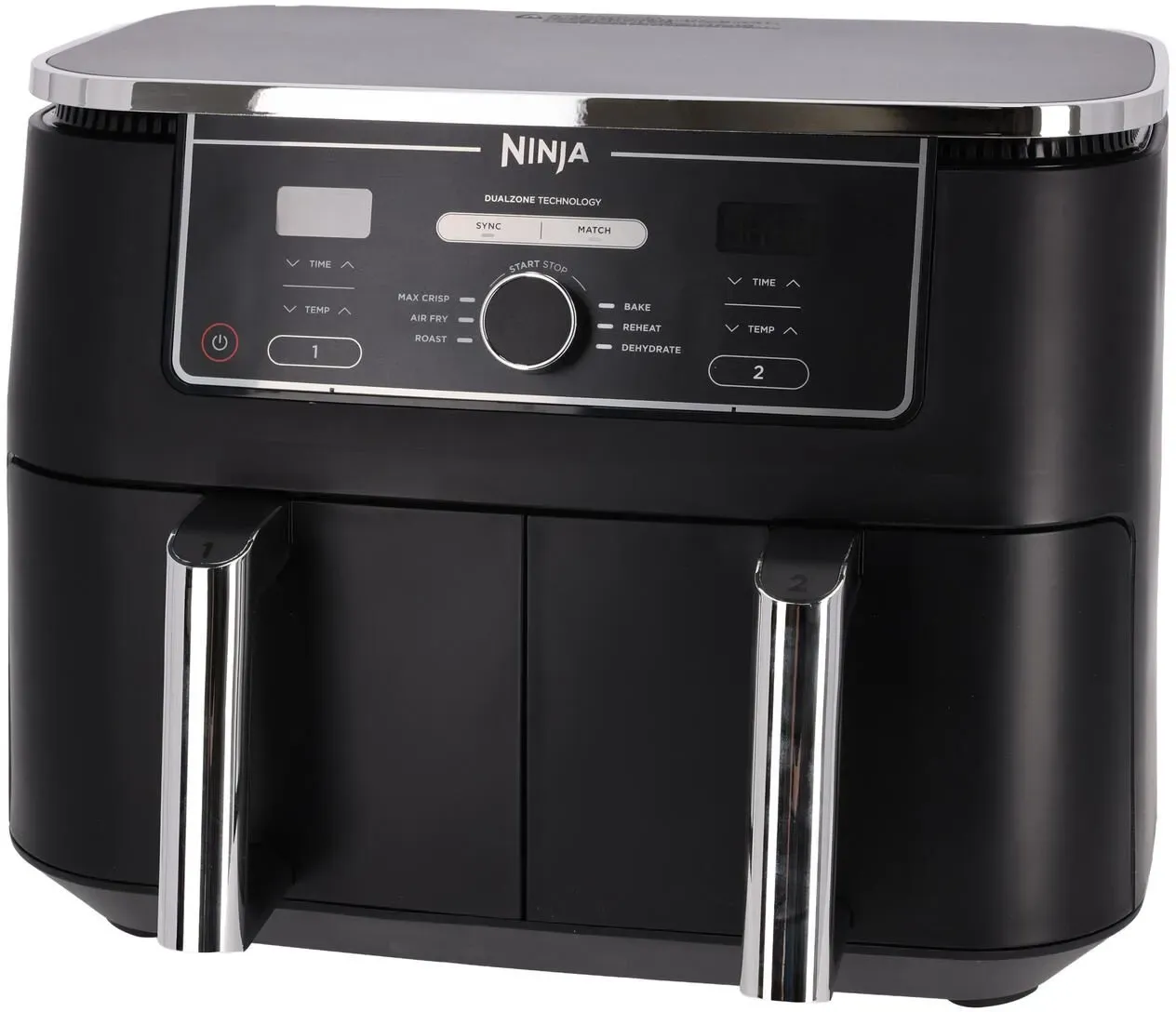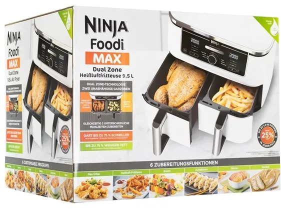 Verfügbarkeit: 2-4 Werktage - Kategorie: Fritteusen - Ninja - GTIN:0622356245272 - Bringen Sie Ihre Mahlzeiten auf den Punkt €“ mit der Großraum-Heißluftfritteuse die zwei Gerichte auf zwei Arten gart und gleichzeitig fertigstellt. - 129,99 Euro bei ninjakitchen.de - gefunden von billiger.de QVC bietet die Ninja Foodi MAX Dual Zone AF400EU für 129.99 Euro an, was ein guter Preis für ein Neugerät mit der Möglichkeit der Ratenzahlung sein kann. ![]() ![]() Ninja® NINJA® Heißluftfritteuse Foodi MAX Dual Zone AF400EU 9,5L Gesamtvol.