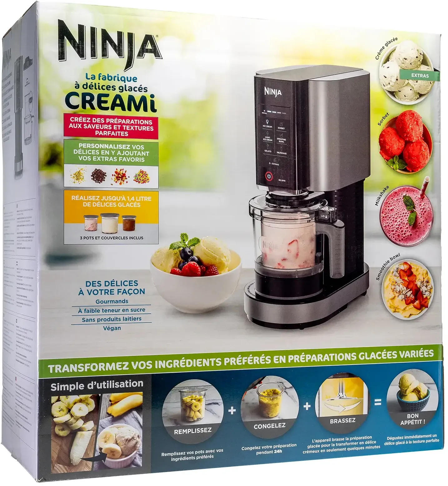 35 Händlerangebote bei billiger.de - Kategorie: Eismaschinen - Ninja - Kreieren und stellen Sie individuelle hausgemachte Köstlichkeiten mit Ihrer Eismaschine her, ganz nach Ihrem Geschmack. Genießen Sie köstliche Eiscreme, cremiges Gelato, reichhaltige Milchshakes, zarte Fruchtsorbets, Frozen Yogurt, kalorienarme Smoothie-Bowls und vieles mehr. Füllen Sie einfach alle Zutaten in den Behälter, frieren Sie diese 24 Stunden lang ein und rühren Sie sie dann innerhalb weniger Minuten bis zur perfekten Konsistenz. Reichhaltig, zuckerarm, laktosefrei oder vegan €“ Sie haben die Wahl! Nutzen Sie das €žExtras€œ-Programm, um Ihre Köstlichkeiten noch besonderer zu machen, indem Sie Chocolate Chips, Süßigkeiten, Nüsse und Keksstücke mit Präzision und Kontrolle unterheben. Mehr als nur eine Eismaschine: Kreieren Sie Getränke, Desserts und Köstlichkeiten für jede Tageszeit dank 7 voreingestellter Programme €“ Eiscreme, Gelato, Sorbet, Smoothie-Bowl, Light Eiscreme, Milchshake & Extras. Spülmaschinenfeste, abnehmbare Teile erleichtern die Reinigung. - GTIN:0622356243391 Dieses Angebot für die Ninja Creami NC300EU ist besonders attraktiv, da es die Basisfunktionen zu einem sehr guten Preis bietet. ![]() ![]() Ninja Eismaschine Eismaschine Creami NC300EU - Schwarz / Silber