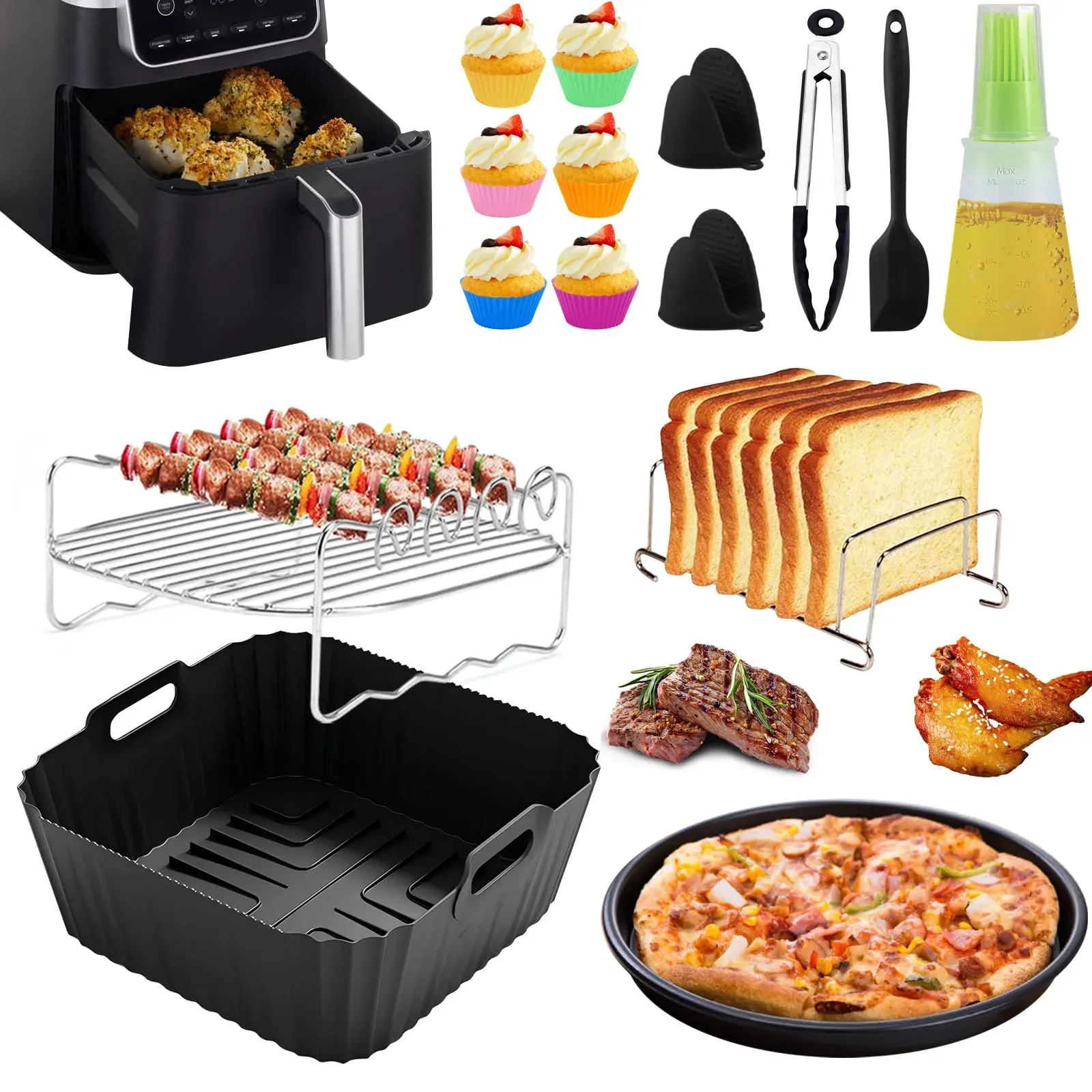 Kategorie: Küchengeräte-Zubehör - HLEIUKT - Kompatibel mit Silikonform Heißluftfritteuse - Dieses ninja af180eu Zubehör Heißluftfritteuse Entwickelt für die Ninja Heißluftfritteuse Max Pro 6,2L AF180EU AF181 Philips NA230 6.2L, COSORI TurboBlaze 5,5L/6,0L, Cecotec 6L, kompatibel mit 4,7L AF140EU AF141. Die Größe Silikonform für Heißluftfritteuse 19 x 19 x 7.5 cm (7.48 x 7.48 x 2.95 Zoll). Bitte messen Sie vor dem Kauf den Innendurchmesser Ihres Heißluftfritteusenkorbs, damit er genauer ist. Lebensmittelqualität Silikon Hitzebeständiges Material - ninja heißluftfritteuse zubehör besteht aus Bestehen zu 100 % aus lebensmittelechtem Material, Der Silikonform der Heißluftfritteuse besteht aus lebensmittelechtem Silikon, das wiederverwendbar und umweltfreundlich ist, BPA-freiem, oder raue Materialien, hohen Temperaturen standhält und lange haltbar ist. Grillrost für Zubehör Ninja Heißluftfritteuse - Die Grillrost für ninja af180eu Heißluftfritteusen bestehen aus langlebigem und robustem Edelstahl 304, sicher, ungiftig und langlebig, verhindert Rost und ist hoch hitzebeständig. Das Gitterdesign kann die beste Luftzirkulation erreichen, um Lebensmittel knuspriger zu machen.Erhöhen Sie die Kapazität der Luftfritteuse und ermöglichen Sie das Kochen von mehr Gegenständen gleichzeitig, ohne dass sie sich berühren. 2-in-1-ölflaschenbürste aus Silikon - Verwendung von lebensmittelechtem Silikon, Hochfeste Silikonborsten, kein Haarausfall und keine Verformung, Gewindedesign am ... ![]() ![]()