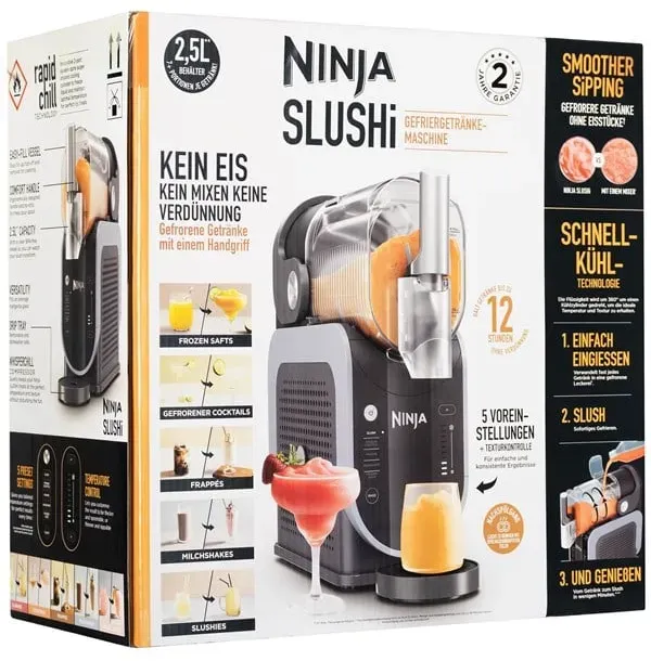 60 Händlerangebote bei billiger.de - Kategorie: Eismaschinen - Ninja - Tschüss Mixer, hallo zu kinderleichter Zubereitung von Eisgetränken mit dem Ninja SLUSHi. Kein Eis, keine scharfen Klingen, kein Mixen €“ einfach eingießen, zum Slush verarbeiten und genießen. Lust auf Frozen Saft, Frappés wie im Café, kreative Cocktails oder Mocktails? Kein Problem! Mit Ninja SLUSHi lassen sich alle beliebten Kaltgetränke in einen Slush verwandeln. Der SLUSHi ist super einfach zu bedienen und leicht zu reinigen ... Cool, oder? Voller Geschmack Flüssigkeit wird zu Slush, voller Geschmack bleibt €“ mit Ninja SLUSHi. Kein zusätzliches Eis €“ also keine Verwässerung, sondern Eisgetränke mit vollem Geschmack. Blitzschnell gefroren und lange kalt Mit der Rapid Chill-Technologie lässt sich Flüssigkeit in nur 30 Minuten* in einen erfrischenden Slush verwandeln. Einmal eingefroren, bleibt es bis zu 12 Stunden** gefroren. Den ganzen Tag, die ganze Nacht €“ mit SLUSHi fließen die Eisgetränke immer weiter. Fünf Voreinstellungen für die beliebtesten Eisgetränke Die Zubereitung der verschiedenen Eisgetränke verläuft unterschiedlich. Ob cremiger Milchshake oder eine klassische Frozen Margarita €“ beides braucht die perfekte Konsistenz und Temperatur. Ninja SLUSHi kreiert auf Knopfdruck perfekte Eisgetränke für jeden Anlass €“ mit den fünf Voreinstellungen Slush (Slush), Frozen Cocktail (Frozen Cocktail), Frappé (Frappé), Milkshake (Milchshake), Frozen Juice ... Die Ninja CREAMi Deluxe NC502EU ist eine weitere hochwertige Option mit 10 Funktionen und 2 Behältern für vielfältige Kreationen. ![]() ![]() Ninja CREAMi Deluxe Eiscreme- & Dessertmaschine mit 2 Behältern, 10 Funktionen, Macht Eiscreme, Gelato, Sorbet, Frozen Yogurt, Milchshakes, Slushies & mehr, 2-in-1 Geschmacksoption, Silber, NC502EU