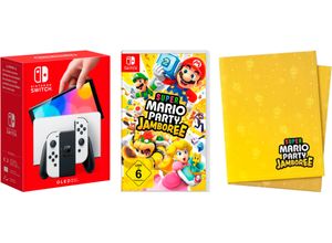 Nintendo - Entdecke zusammen mit Mario das Weltall in Super Mario Galaxy 1+2 für die Nintendo Switch OLED Blau/Rot. Springe von Planet zu Planet, nutze neue Fähigkeiten und erkunde die einzelnen Galaxien. Das 7 Zoll große OLED-Display ist größer als das der normalen Switch und besteht aus stabilem Glas. Das Display sorgt dafür, dass die Farben beim Zocken satter erscheinen und der Kontrast höher ist. Für eine Runde Mario Kart mit der ganzen Familie schließt du die Nintendo Switch auch einfach an deinen Fernseher an. Zudem hat sie eine Speicherkapazität von 64 GB, sodass du noch mehr Platz für Spiele hast. Mit dem breiten Ständer dieser Nintendo Switch bleibt dein Display stabiler auf einem Tisch stehen. Die Dockingstation der Nintendo Switch OLED hat einen LAN-Anschluss, sodass du deine Switch auch über Kabel mit dem Internet verbindest. - bei coolblue.de - aus Yadore Produktdaten Dieses Konsolen-Set ist empfehlenswert, da es die Nintendo Switch OLED mit einem beliebten Mario Party-Spiel und einer exklusiven Decke kombiniert. ![]() NINTENDO SWITCH Konsolen-Set 'OLED weiß inkl. Mario Party Jamboree und exklusiver Nintendo Decke', weiß, B:24,2cm H:1,39cm T:10,2cm, Spielekonsolen