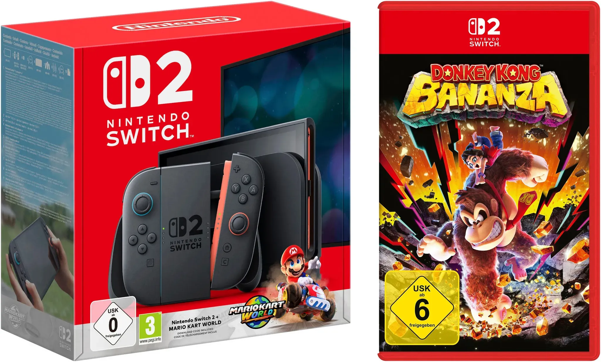 Nintendo Switch 2 - EAN: 4068222958130 - Bestseller. Farbe: Farbbezeichnung: schwarz, Bestandteile: Anzahl Controller im Lieferumfang: 2, Spiele im Lieferumfang: Mario Kart World, Donkey Kong Bananza, Controller im Lieferumfang: Joy-Con 2 Controller, Datenträger Spiele: Speicherkarte,... - bei baur.de - aus Yadore Produktdaten Dieses Bundle von Baur Versand enthält die Switch 2, Mario Kart World und Donkey Kong Bananza, was eine gute Spielauswahl bietet. ![]() NINTENDO SWITCH 2 Konsolen-Set 'Switch 2 + Mario Kart World + Donkey Kong Bananza', schwarz, B:27,2cm H:16,6cm T:1,39cm, Spielekonsolen, Topseller