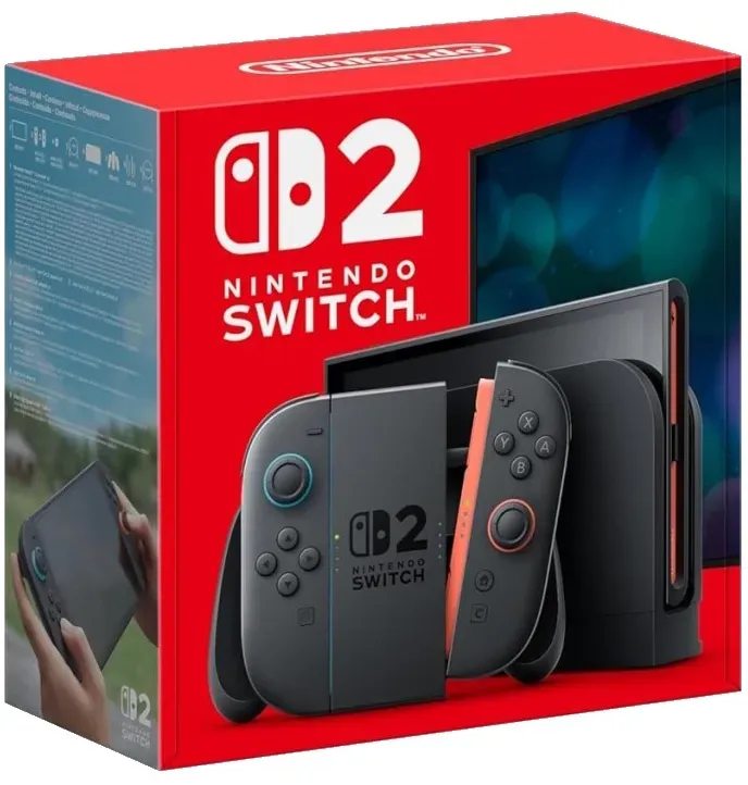 Nintendo - EAN: 0045496321444 - Mit der Nintendo Switch 2 spielst du deine Lieblings-Games bequem zu Hause auf dem Fernseher oder auch unterwegs. Die Nintendo Switch 2 ist die verbesserte Version der Nintendo Switch und verfügt über neue Funktionen. Sie ist größer als ihre Vorgängerin und hat außerdem bessere Joy-Cons. Das Design der Joy-Cons ist ergonomischer, sodass diese besser in der Hand liegen. Auf der neuen Nintendo Switch 2 spielst du auch deine alten Nintendo Switch Games. So hast du auch weiterhin noch Spaß an Mario Kart 8 Deluxe und Pok mon Karmesin oder Purpur. über die neue Funktion GameChat unterhältst du dich einfach mit Freunden und den optischen Sensor im Joy-Con nutzt du für Präzision. Schließe die Switch 2 über die mitgelieferte Dockingstation an deinen Fernseher an und zocke zusammen mit deiner Familie oder Freunden die lustigsten Partyspiele. Musst du plötzlich los? Dann entferne die Switch aus der Dockingstation und game im Zug oder Auto einfach im Handheld-Modus weiter. Mit dem ausklappbaren Standfuß stellst du die Nintendo Switch 2 ganz einfach auf dem Tisch auf. Der Standfuß ist stabiler als der einer normalen Nintendo Switch. - bei coolblue.de - aus Yadore Produktdaten Die Nintendo Switch 2 Konsole zu einem wettbewerbsfähigen Preis, ideal für preisbewusste Käufer. ![]() Nintendo Switch 2, Spielkonsole