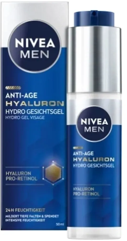 Feuchtigkeitscreme Gesichtscremes Gesamtsortiment Beauty + Gesundheit Gesichtspflege Gesichtscreme - EAN:9005800340883 - Erste Falten, feine Linien und trockene Haut? Die Nivea Men Anti-Age Hyaluron Feuchtigkeitscreme für das Gesicht enthält eine hohe Konzentration an Hyaluronsäure, die die Gesichtshaut erfrischt, mit Feuchtigkeit versorgt und revitalisiert. Die leichte Gel-Textur zieht schnell ein und hinterlässt keine fettigen Rückstände auf der Haut. Der Teint wirkt sichtbar geglättet und strahlend mit einem völlig neuen Glow. Dank Lichtschutzfaktor 15 hilft sie, der durch übermässige Sonneneinstrahlung verursachten Hautalterung und Faltenbildung vorzubeugen. Verleihen Sie Ihrer Haut ein jugendliches Aussehen mit der Nivea Men Anti-Age Hyaluron Feuchtigkeitscreme für das Gesicht. - gefunden von Kelkoo Dieses Gesichtsgel für 17,70 Euro ist ideal für alle, die eine leichte, schnell einziehende Textur bevorzugen. ![]() NIVEA MEN, Gesichtscreme, Anti-Age Hyaluron Hydro Gesichtsgel (50 ml, Gesichtsgel)