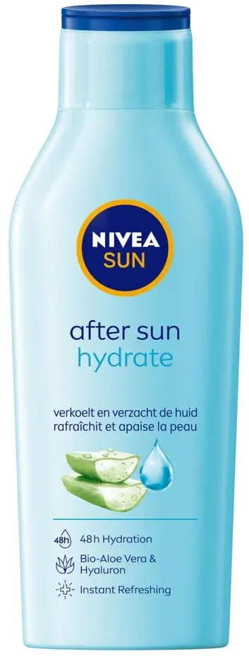 4 Händlerangebote bei billiger.de - Kategorie: Sonnenpflege - NIVEA - After Sun Die beruhigende NIVEA SUN After Sun Lotion spendet intensive Feuchtigkeit und hilft sonnengestresster Haut dabei, sich zu entspannen. Sanft & kühlend Mit ihrer leichten, nicht klebenden Textur zieht die Feuchtigkeitspflege schnell ein und kühlt die Haut nach der Sonnenexposition. Intensive Feuchtigkeit Mit Bio-Aloe Vera und Hyaluron spendet die hautberuhigende Lotion der Haut nach dem Sonnenbad 48 Stunden lang Feuchtigkeit. Pflegende Formel Die NIVEA After Sun Lotion hilft, den Feuchtigkeitsverlust der Haut wiederherzustellen und das Abblättern oder Schuppen zu vermeiden. Lieferumfang & Details NIVEA SUN Pflegende After Sun Lotion, 400 ml, mit nicht klebender & nicht fettender Textur, für sofortige Linderung sonnenstrapazierter Haut, Artikelnr. 80465 - GTIN:4006000139395 ![]() ![]() NIVEA After Sun Pflegende Lotion 400 ml