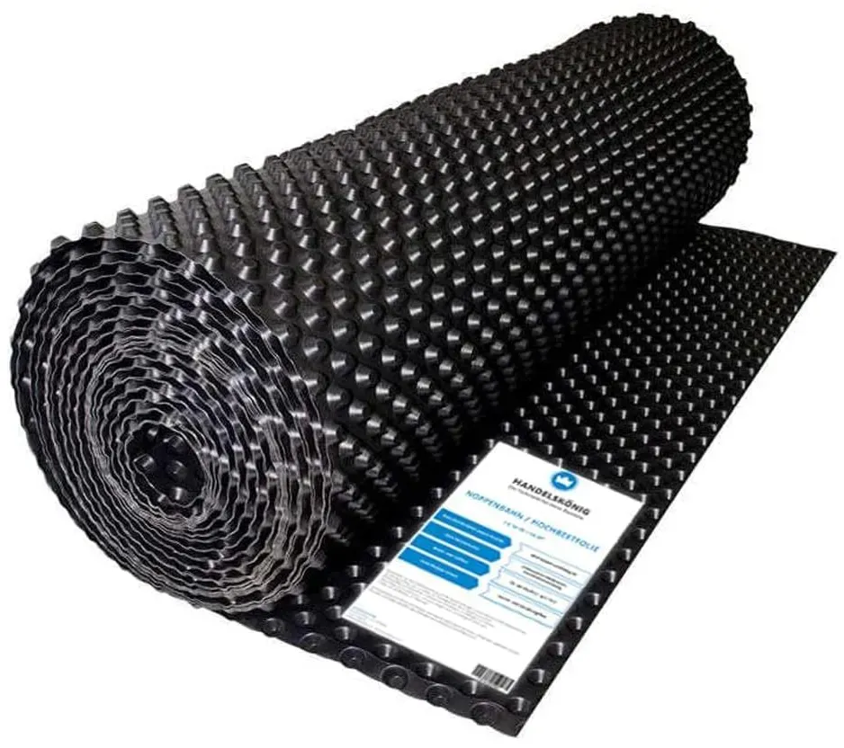 Kategorie: Baumaterial - Handelskönig - GTIN:4251343634827 - ANWENDUNGSBEREICH: Grundmauerschutz, Bauwerkdrainage, Dichtungsbahn in Wänden und Decken, Abdichten von Grünflächen auf Dächern, zum Bau von Hochbeeten. TECHNISCHE DATEN: Stärke: ca. 0,5 mm, Breite: 150 cm (+/- 3 % Toleranz), Länge: 20 m, Noppenhöhe: ca. 6 mm, Luftvolumen zwischen den Noppen: ca. 5,3 l/m3. EIGENSCHAFTEN: wurzelfest, verrottungsfest, chemikalienbeständig, trinkwasserunbedenklich, beständig gegen Pilz- und Bakterienbefall, B2 nach DIN 4102. Farbe: schwarz. EXPERTEN TIPP: Diese Noppenfolie ist frei von Weichmachern und somit sehr gut geeignet als Hochbeetfolie. TOP QUALITäT: Die Noppenbahn hat eine hohe beständigkeit gegen Feuchte und ist trinkwasserunbedenklich. - 37,90 Euro bei Amazon Marketplace Home Improvement - gefunden von billiger.de Diese Noppenfolie bietet eine robuste Qualität (400g/m²) für Mauerschutz und Drainage auf einer großen Fläche von 30 m² zu einem attraktiven Preis. ![]() ![]() Noppenfolie Mauerschutz Noppenbahn Grundmauerschutz Drainagebahn Grundmauerfolie 400g/m2 (1,5m (breit) x 20m (lang))
