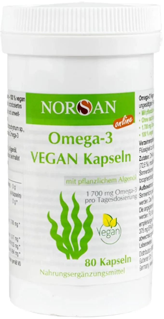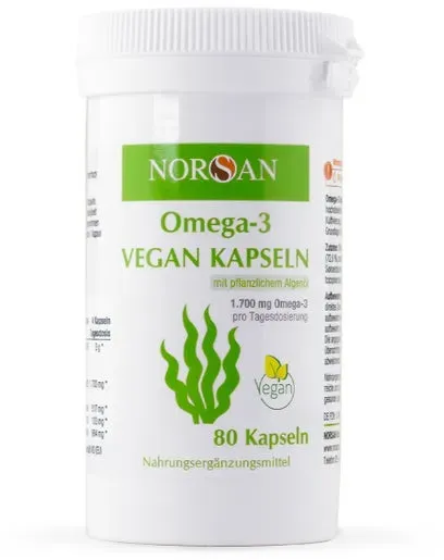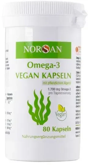 Zustand: Neu - 0,33 / Stck - Omega-3 Omega-3 l - NORSAN San Omega GmbH, Gubener Str. 47, 10243 Berlin, Deutschland - ONLINE_Vegan-Kapseln_NEU_80er - EAN: 4260698150258 - 1.700MG PREMIUM OMEGA 3 - hochdosiertes veganes Omega 3, um den durch studienbelegten notwendigen Tagesbedarf von mindestens 1.500 Omega-3 auch bei veganer Ernhrung zu decken. 100% VEGANES & NACHHALTIGES OMEGA 3 ALGEN L - das Omega 3 pflanzlich entsteht in knstlichem Meerwasser, um die Fisch- & Krill-Bestnde zu schonen, denn wir sind uns der Verantwortung gegenber dem Meer bewusst. FR DEINEN VEGANEN LIFESTYLE - EPA & DHA sind ausschlielich in marinen Omega 3 Quellen enthalten. Unser NORSAN Omega 3 Premium Algen l ist mit seinen Gehalt an EPA & DHA einmalig in der Dosierung. NORSAN OMEGA-3 VEGAN FR HERZ, HIRN & AUGE - Laut der EFSA wirken DHA & EPA im Norsan Omega 3 vegan l ab einer Menge von 250mg tglich positiv auf die Herzfunktion, Sehkraft & das Gehirn aus. MAXIMAL VERTRGLICHE VEGANE OMEGA 3 KAPSELN - Der geringe TOTOX-Wert des Algenls von NORSAN unter 4 sorgt fr einen frischen Geschmack & maximiert die Bioverfgbarkeit von unseren NORSAN vegan Omega 3 Kapseln. - Verkufer: NORSAN im amazon.de Marketplace Dieses vegane Produkt bietet eine hohe Dosis Omega-3 aus Algenöl und ist somit ideal für alle, die auf tierische Produkte verzichten möchten. ![]() ![]() NORSAN Premium Omega 3 Vegan Kapseln 80 Stück - 1.700mg Omega 3 pro Tagesdosis - vegane Algenöl Kapseln mit hohem EPA- & DHA-Anteil - Algenöl aus nachhaltigem Anbau
