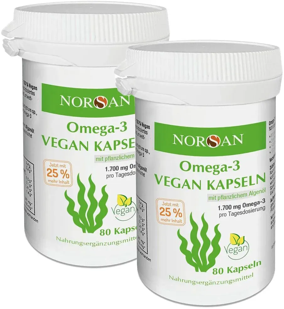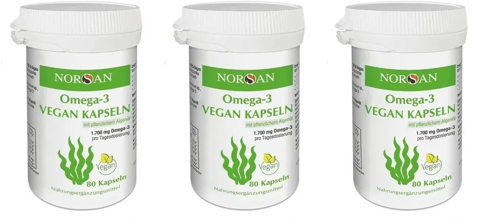 Zustand: Neu - 262,90 / l - Omega-3 Omega-3 l - NORSAN NORSAN GmbH, Plauener Stae 163-165, Haus E, 13053 Berlin - ONLINE_Vegan_Oel_IT_Parent - EAN: 4260698150067 - ️PREMIUM VEGANES OMEGA-3 - Zur Deckung des studienbelegten notwendigen Tagesbedarfes von 1.500 - 2.000 mg Omega-3. Ein Teelffel Omega-3 Premium l deckt Ihren Tagesbedarf mit 2.000 mg. ️VERFEINERE DEINE MAHLZEIT - Das NORSAN Omege-3 Vegan l lsst sich einfach in Mahlzeiten integrieren. Das vegane Algenl flssig eignet sich als Zutat im Salatdressing, im Smoothie oder als Porridge-Topping. ️ FR DEINEN VEGANEN LIFESTYLE - EPA & DHA sind ausschlielich in marinen Omega-3 Quellen enthalten. Unser NORSAN Omega 3 vegan l ist mit seinen hohen EPA- & DHA-Anteil einmalig in der Dosierung. ️ OMEGA-3 FR HERZ, HIRN & AUGE - Laut der Europischen Behrde fr Lebensmittelsicherheit (EFSA) wirken DHA & EPA ab einer Menge von 250 mg tglich positiv auf die Herzfunktion, Sehkraft & das Gehirn aus. ️MAXIMAL VERTRGLICHES VEGANES OMEGA 3 - Der geringe TOTOX-Wert des Omega-3 l von 4 sorgt fr einen frischen Geschmack. - Verkufer: NORSAN im amazon.de Marketplace Diese Kapseln sind eine solide Wahl für den täglichen Bedarf an Omega-3 und bieten eine hohe Konzentration pro Tagesdosis. ![]() ![]() NORSAN Premium Omega 3 Vegan Kapseln 80 Stck - 1.700mg Omega 3 pro Tagesdosis - vegane Algenl Kapseln mit hohem EPA- & DHA-Anteil - Algenl aus nachhaltigem Anbau