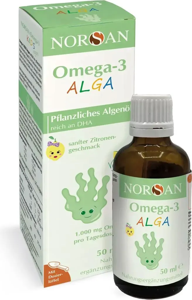 Verfügbarkeit: 4-7 Werktage - 360,00 / 1 l - Kategorie: Nahrungsergänzungsmittel - NORSAN - GTIN:4260698151286 - NORSAN Omega-3 ALGA Kids Vegan Pflanzliches DHA-Algenöl für KinderUnterstützen Sie die gesunde Entwicklung Ihres Kindes mit NORSAN Omega-3 ALGA Kids Vegan. Dieses hochwertige, pflanzliche Algenöl liefert wertvolle Omega-3-Fettsäuren (DHA) und veganes Vitamin D, die speziell auf die Bedürfnisse von Kindern abgestimmt sind. Mit einem milden Zitronengeschmack und einfacher Dosierung wird die tägliche Einnahme kinderleicht.Vorteile von NORSAN Omega-3 ALGA Kids Vegan100 % pflanzliches Algenöl, reich an DHA.1.000 mg Omega-3-Fettsäuren pro Tagesdosis (2 ml).Enthält 400 I.E. Vitamin D zur Unterstützung der normalen Knochenentwicklung.Sanfter Zitronengeschmack ohne Zuckerzusatz.Nachhaltige und schadstofffreie Kultivierung des Algenöls.Warum ist DHA wichtig für Kinder?DHA (Docosahexaensäure) ist eine essentielle Omega-3-Fettsäure, die zur normalen Entwicklung des Gehirns und der Sehkraft bei Kindern beiträgt (bei einer täglichen Zufuhr von 250 mg DHA). Da der Körper DHA nur in geringen Mengen selbst bilden kann, ist die regelmäßige Zufuhr über die Ernährung besonders wichtig.Einfache AnwendungMit dem beiliegenden Dosierlöffel ist die Einnahme von NORSAN Omega-3 ALGA Kids Vegan besonders unkompliziert. Die empfohlene Tagesdosis beträgt 2 ml und kann pur oder in Speisen wie Joghurt, Smoothies oder Säften eingerührt werden. Der ... Dieses Angebot ist empfehlenswert, da es Norsan Omega-3 Vegan Kapseln zu einem sehr attraktiven Preis von 22.94 Euro anbietet und somit einen guten Einstieg in die Kapselform ermöglicht. ![]() ![]() Norsan Omega-3 Vegan Kapseln 80 St