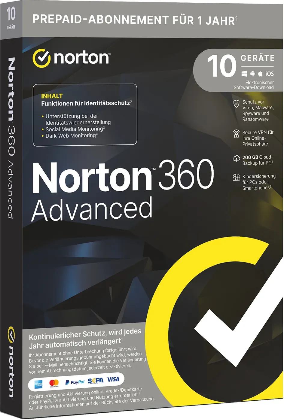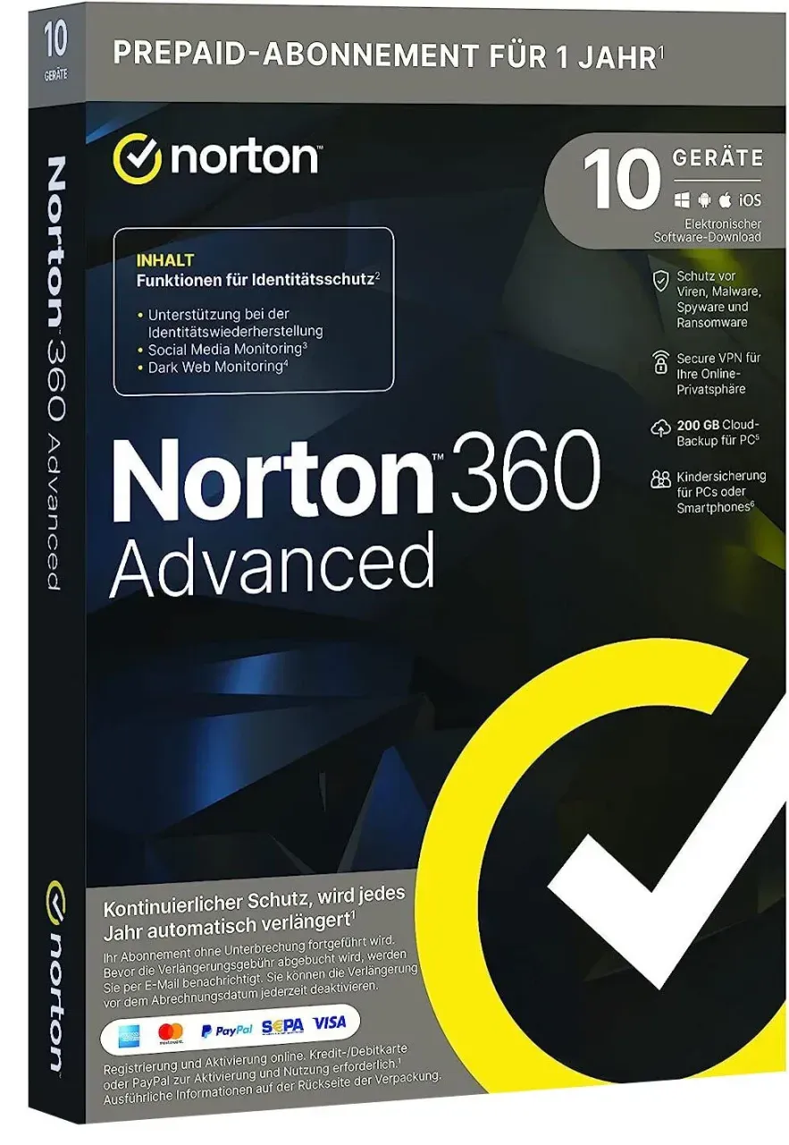 Marken und Modelle: Norton ist eine der bekanntesten und etabliertesten Marken im Bereich Antivirus-Software, mit einer langen Historie und hoher Erkennungsrate bei Malware[1][4][5]. Innerhalb der Norton 360 Produktlinie gibt es verschiedene Pakete: | Produktname | Geräteanzahl | Preis (ca.) | Besonderheiten | |----------------------|--------------|----------------------|---------------------------------------| | Norton Antivirus Plus | 1 Gerät | ca. 19,99 €/Jahr | Basis-Schutz, kein VPN, 2 GB Cloud | | Norton 360 Standard | 1 Gerät | ca. 39,99 €/Jahr | VPN, Webcam-Schutz, Dark Web Monitoring | | Norton 360 Deluxe | 5 Geräte | ca. 49,99 €/Jahr | Kindersicherung, 50 GB Cloud | | Norton 360 Advanced | 10 Geräte | ca. 44,99 € (erstes Jahr), danach ca. 109,99 €/Jahr | Umfassendster Schutz, VPN, Dark Web Monitoring, SafeCam, Kindersicherung, Cloud-Backup | | Norton 360 für Gamer | 3 Geräte | ca. 49,99 €/Jahr | Spiele-Booster, optimiert für Gaming | Der Preisbereich für Norton 360 Advanced liegt bei etwa 45 € im ersten Jahr (Neukundenangebot), danach etwa 110 bis 135 € pro Jahr je nach Laufzeit und Angebot[1][3][4]. Das ist höher als bei den kleineren Paketen, bietet aber auch deutlich mehr Geräteabdeckung und Funktionen. Empfehlung: Wenn Sie mehrere Geräte (bis zu 10) schützen wollen und Wert auf umfassende Funktionen wie VPN, Dark Web Monitoring und Kindersicherung legen, ist Norton 360 Advanced eine sehr gute Wahl. Für weniger Geräte oder geringeren Funktionsumfang sind die günstigeren Pakete (Standard oder Deluxe) preislich attraktiver[1][4]. Zusammenfassend sollten Sie beim Kauf von Norton 360 Advanced auf folgende Punkte achten:
