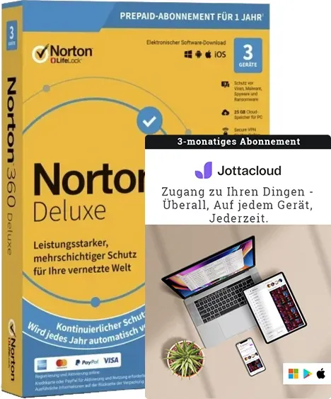 Dieses Angebot ist ein Beispiel für Angebote, die kürzlich auf dem eBay-Marktplatz in der Kategorie 175689 verfügbar waren. Bitte aktualisieren Sie die Suchergebnisse um aktuelle Angebote zu erhalten. Ein weiteres attraktives Langzeitangebot für 3 Geräte und 3 Jahre ohne Abo, inklusive 25 GB Cloud-Speicher, für 49.95 Euro. ![]() ![]() NortonLifeLock Norton 360 Deluxe 2025, inkl. 25 GB, 3 Geräte - 3 Jahre, Download, Kein Abo
