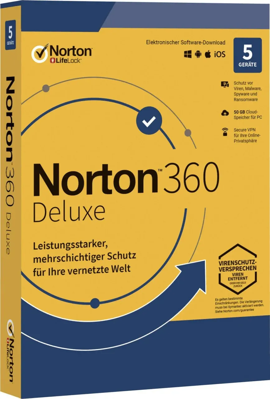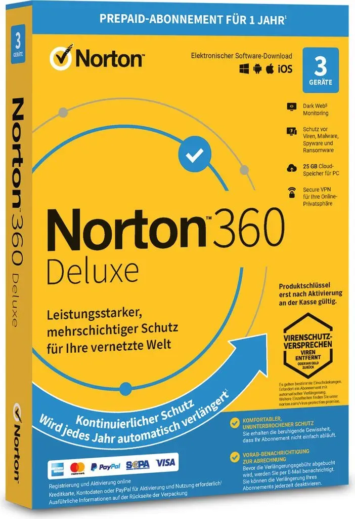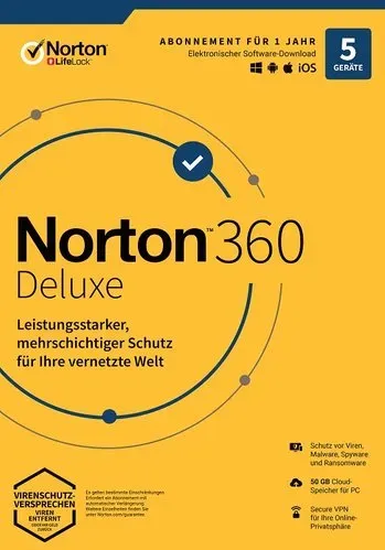 Norton - Internet Security Norton 360 bestimmt für 5 Anlage(n), Abonnementdauer: 24 Monate, Abonnement, Installationsmethode: Download (elektronisch), geeignet für Haushalte, bestimmt für mobile Geräte und PC, kompatibel mit dem Betriebssystem Windows, macOS, Android und iOS, geografische Einschränkung: nur in der EU, den Lizenzschlüssel finden Sie in: 'Meine Bibliothek' - 'Lizenzen' Norton 360 Deluxe Security App für 1 Benutzer und 5 Geräte für 24 MonateNorton 360 Deluxe bietet umfassenden Schutz vor Viren, Malware und Ransomware. Secure VPN bietet einen zusätzlichen Schutz für I - bei alza.de - aus Yadore Produktdaten Dieses Angebot bietet langfristigen Schutz für 5 Geräte über 3 Jahre ohne Abo für 48.39 Euro, was eine kostengünstige Lösung darstellt. ![]() ![]() NORTON 360 - Deluxe 2026 eBay 5 Geräte 3 Jahre | Internet Security AntiVirus | KEIN ABO