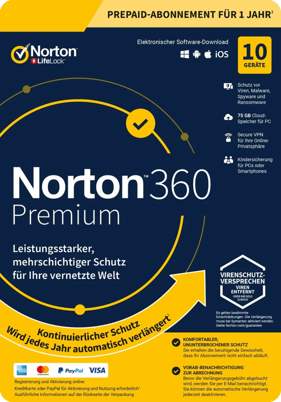 Norton 360 premium 10 geräte 2 jahre META PreisvergleichMit dem Meta-Preisvergleich suchen Sie gleichzeitig bei den großen Preisvergleich Portalen!Jetzt live Suche nach norton 360 premium 10 geräte 2 jahre starten! Norton 360 premium 10 geräte 2 jahre KaufberatungNorton 360 Premium 10 Geräte 2 Jahre - KaufberatungProduktmerkmale und AusstattungDas Norton 360 Premium 10 Geräte 2 Jahre ist eine umfassende Sicherheitslösung mit folgenden Kernfeatures[3]: Geräteschutz und Kompatibilität Die Lizenz schützt bis zu 10 Geräte gleichzeitig, darunter PCs, Macs, Smartphones und Tablets. Das Produkt ist kompatibel mit Windows, Mac, iOS und Android[3], was es ideal für gemischte Geräteumgebungen macht. Cloud-Speicher Ein großer Vorteil ist der inklusive 75 GB Cloud-Speicher für automatische Sicherungen wichtiger Dateien und Daten[3]. Dies ist besonders wertvoll für Familien oder Vielnutzer, die ihre digitalen Inhalte schützen möchten. Sicherheitsfunktionen Die Software bietet umfassenden Virenschutz sowie fortschrittliche Datenschutz- und Identitätssicherungsfunktionen[3]. Zusätzlich ist ein Secure VPN enthalten[5]. Preisbereich und aktuelle AngeboteDie Preise für Norton 360 Premium 10 Geräte 2 Jahre variieren je nach Anbieter erheblich[1][2][9]: