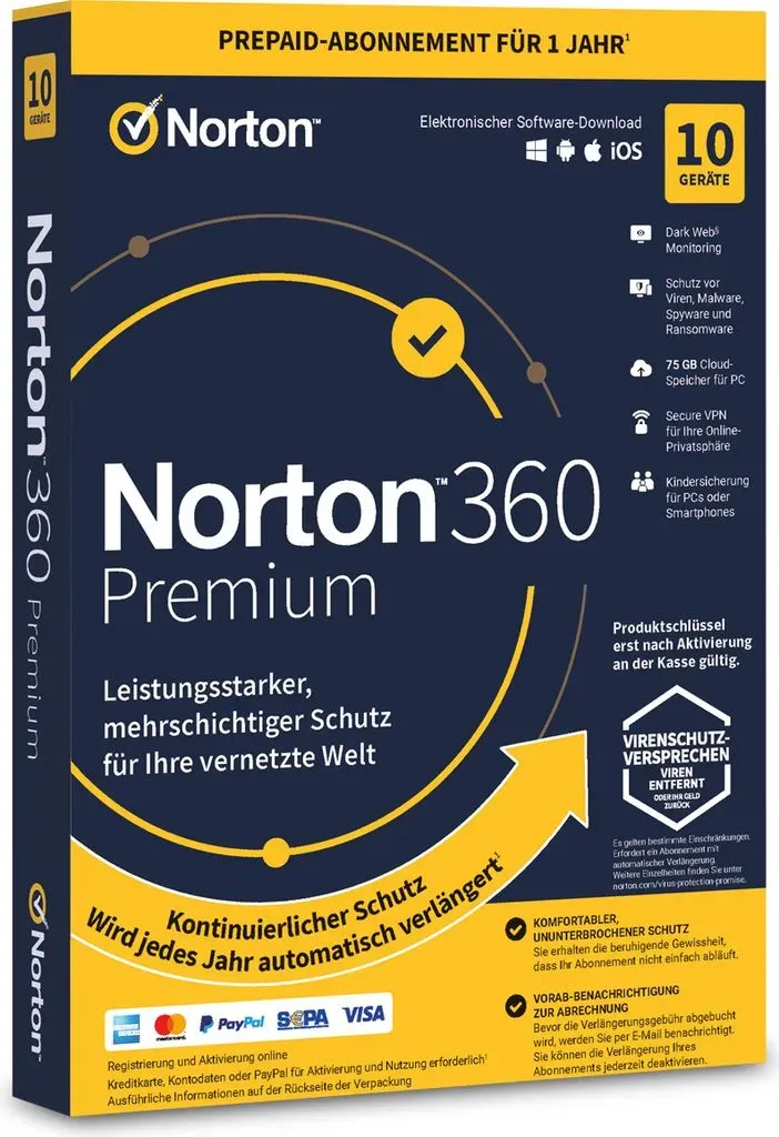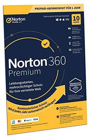 Zustand: Neu - Betriebssysteme - NORTONLIFELOCK NortonLifeLock - - EAN: 0049817224315 - BedrohungsSchutz in Echtzeit - Innovative Sicherheit trägt zum Schutz vor bekannten und neu aufkommenden Online-Bedrohungen bei, darunter Ransomware, Spyware, Viren, Phishing und mehr! 75 GB Cloud-Backup für PC - Automatisches Cloud-Backup für Windows PC Secure VPN - Surfen Sie anonym und besser geschützt mit einem VPN ohne Logfiles. Profitieren Sie von hochgradig sicherer Verschlüsselung, um zu verhindern, dass sensible Daten wie Passwörter und Bankdaten abgegriffen werden. Safecam für PC - Sie werden benachrichtigt, wenn Cyberkriminelle versuchen, auf die Webcam Ihres Windows-PCs zuzugreifen, und wir können helfen, den Angriff abzuwehren. Dank automatischer Verlängerung, erhalten Sie kontinuierlichen Schutz für Ihrer Geräte - Verkäufer: Systeme & Software im amazon.de Marketplace Für 24.90 Euro erhalten Sie hier die Version 2025 ohne Abo-Zwang, was eine gute Option für langfristige Nutzung ohne automatische Verlängerung ist. ![]() ![]() NortonLifeLock Norton 360 Premium 2025 | 10 Geräte 1 Jahr | 75 GB Cloud-Backup | Kein Abo