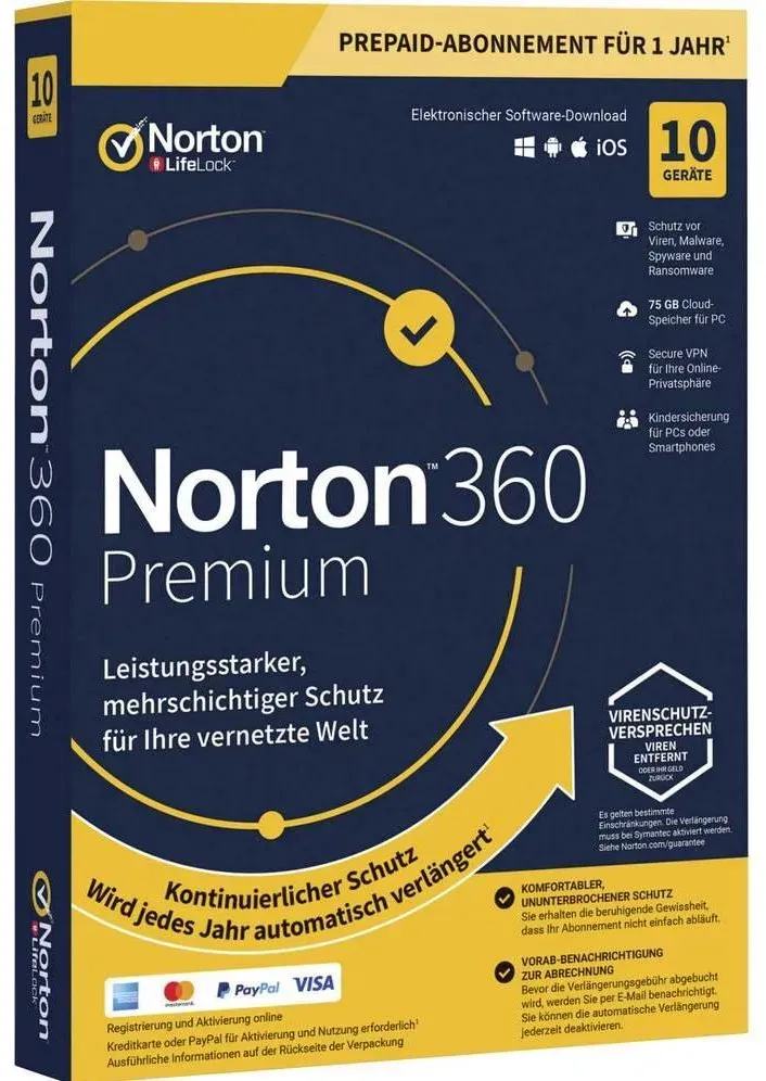 Zustand: Neu - Antivirus & Internet Security - Norton Gen Digital - - - Norton 360 Deluxe schützt bis zu 5 PCs, Macs, Android- und iOS-Geräte auf mehreren Ebenen. Es sichert die Online-Privatsphäre und überwacht das Dark Web. Gleichzeitig verbessert Norton Utilities Ultimate Rechenleistung, Arbeitsspeicher und Festplatte von PCs ohne zu stören. Das ist maximale Sicherheit und Performance auf einen Schlag. - Verkäufer: Amazon Media EU Sarl im amazon.de Marketplace Für Nutzer, die speziell ihre Online-Privatsphäre schützen möchten, ist Norton WiFi Privacy eine gute Ergänzung. ![]() ![]() NortonLifeLock Symantec Norton WiFi Privacy 1.0