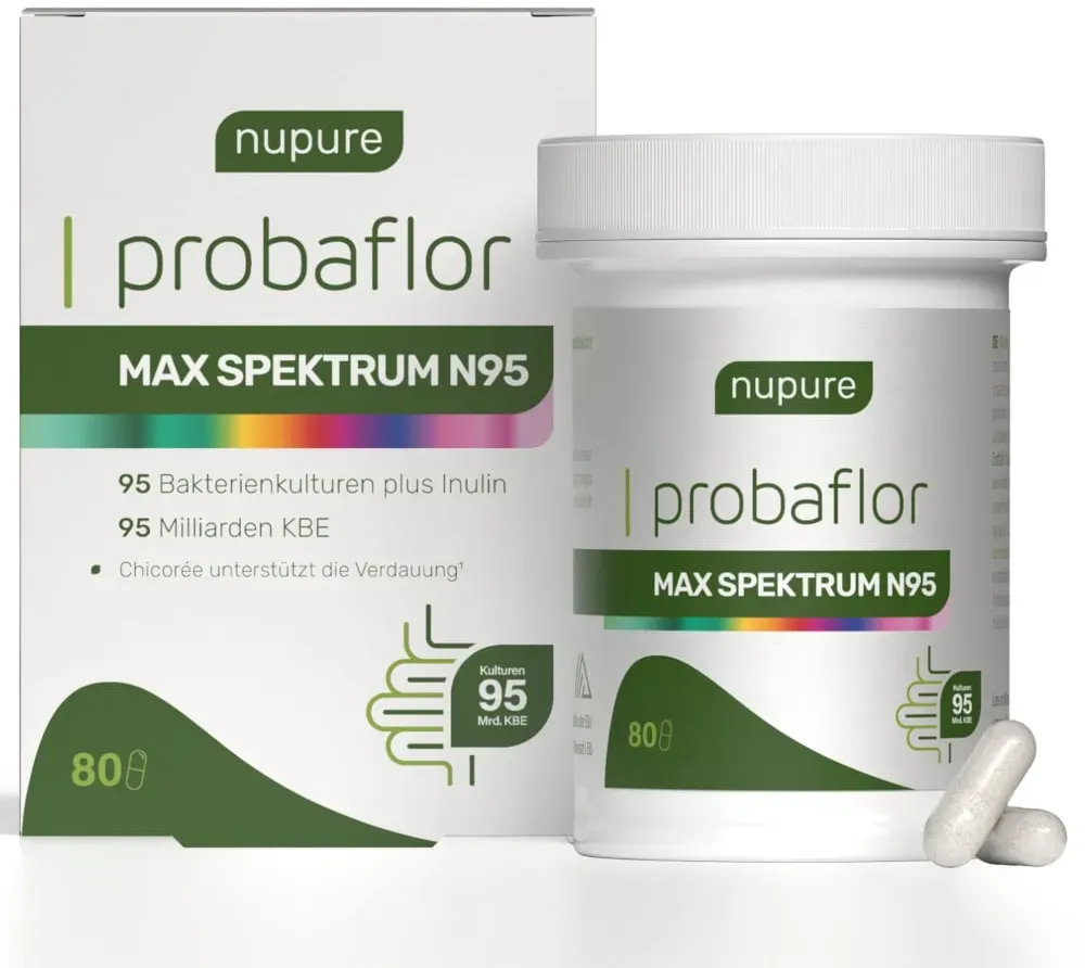Zustand: Neu - 1.565,29 € / kg - Lactobacillus Probiotika Lactobacillus - nupure Aixswiss - - EAN: 8721082482097 - 🌈95 verschiedene Bakterienstämme: Nupure Probaflor MAX SPEKTRUM N95 enthält 95 unterschiedliche Bakterienstämme in einer Kombination, die für eine besonders breite Auswahl an Kulturen sorgt. 🦠Hohe Tagesmenge:Jede Tagesdosis enthält 95 Milliarden KBE (koloniebildende Einheiten). Pro Gramm sind mehr als 600 Milliarden KBE enthalten. ðŸ”Magensaftresistente Kapseln und Activ-Vial-Verpackung: Die Kapseln sind magensaftresistent. Das Produkt wird in einem Activ-Vial-Behälter geliefert, der den Inhalt bis zum Ende der Haltbarkeit schützt. ðŸ€Rezeptur aus natürlichen Inhaltsstoffen: Probaflor MAX SPEKTRUM N95 besteht zu 100€¯% aus natürlichen Inhaltsstoffen und ist frei von Gluten, Fruktose und Zucker. - 3 Händler im amazon.de Marketplace ![]() ![]() Nupure® Probaflor MAX SPEKTRUM N95 ? 600 Mrd. KBE/g, 95 Bakterienstämme, mit Lactobacillus, Inulin & Bifidobakterien, 95 Mrd. KBE, magensaftresistent, 80 Kapseln