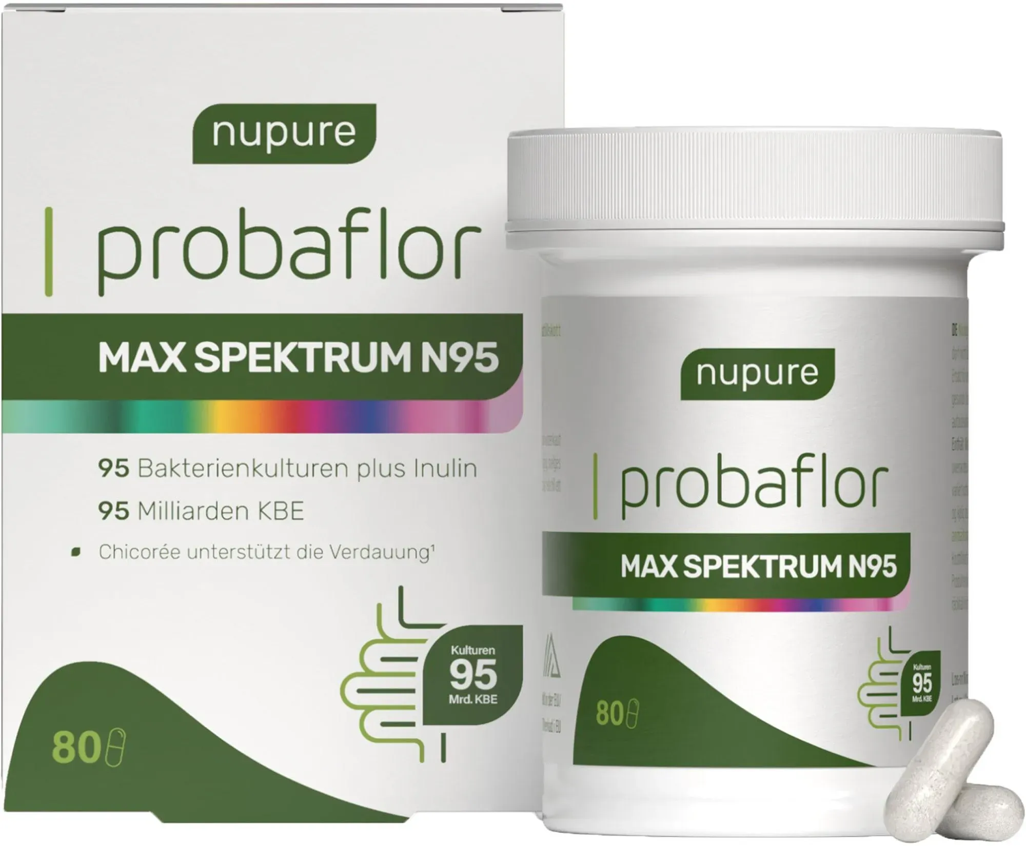 AixSwiss B.V. - EAN: 8721082482097 - Nupure Probaflor MAX SPEKTRUM N95Das weltweit breiteste Spektrum an Bakterienstämmen95 wissenschaftlich geprüfte Bakterienstämme95 Milliarden KBE in ultrahoher DosierungMit Chicor e und Vitamin B2 zur Unterstützung der Verdauung und der Darmschleimhaut Das Darmmikrobiom ist ein Komplex aus zahlreichen Bakterienarten, deren Vielfalt entscheidend ist. Probaflor MAX SPEKTRUM N95 spiegelt mit 95 geprüften Stämmen und 95 Milliarden KBE die höchste auf dem Markt verfügbare Vielfalt wider, um das Mikrobiom zu fördern. Diese Bakterienstämme wurden aufgrund ihrer spezifischen, wissenschaftlich nachgewiesenen Eigenschaften ausgewählt.Unsere magensaftresistenten Kapseln stellen sicher, dass die Bakterien den Magen passieren und im Darm freigesetzt werden. Die innovative Activ-Vial -Verpackung schützt die Bakterien bis zum Ende der Haltbarkeitsdauer und sichert so die hohe Dosierung.Enthält 95 verschiedene Bakterienstämme, Inulin und Vitamin B2Packung mit 30 KapselnJede Tagesdosis liefert 95 Milliarden KBEFrei von Gluten, GVO und ZuckerPharmazeutische Qualität Chicor e fördert die Verdauung - Die Bewertung der gesundheitsbezogenen Aussagen ist ausstehend. Vitamin B2 unterstützt die Gesunderhaltung der Schleimhäute.Für maximalen Schutz ohne Kühlung verwenden wir spezielle Activ-Vial Dosen, um eine hohe überlebensrate der Bakterien zu erhalten.Anwendung:Erwachsene nehmen täglich 2 Kapseln mit einem Glas Wasser ein.Hinweis: Die empfohlene Tagesdosis ... ![]() ![]() NUPURE probaflor Max Spektrum N95 magensaftr.Kaps. 80 St.