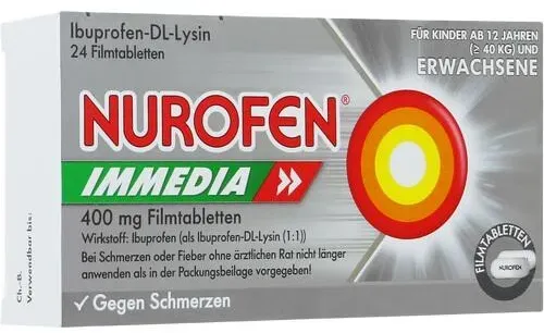 0,29 /Stück - Kategorie: Arzneimittel - RB Deutschland GmbH - GTIN:4002448064831 - PZN:08794442 - Nurofen Immedia 400 mg Filmtabletten Wirkstoff: Ibuprofen-DL-Lysinat Anwendungsgebiete: Anwendungsgebiete: Symptomat. Behandlung leichter bis mäßig starker Schmerzen wie Kopf- Zahn- und Regelschmerzen, Fieber. - Für Erwachsene und Jugendliche ab zwölf Jahren geeignet (ab 40 kg) - 3,44 Euro bei medikamente-per-klick.de - gefunden von billiger.de Die DocMorris Apotheke bietet 12 Tabletten für 3.62 Euro an, was ein gutes Preis-Leistungs-Verhältnis darstellt. ![]() ![]() RB Deutschland GmbH NUROFEN Immedia 400 mg Ibuprofen Filmtabletten 12 St