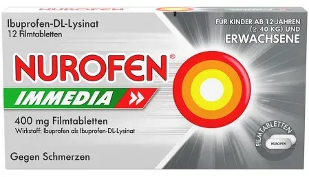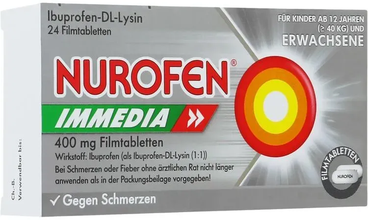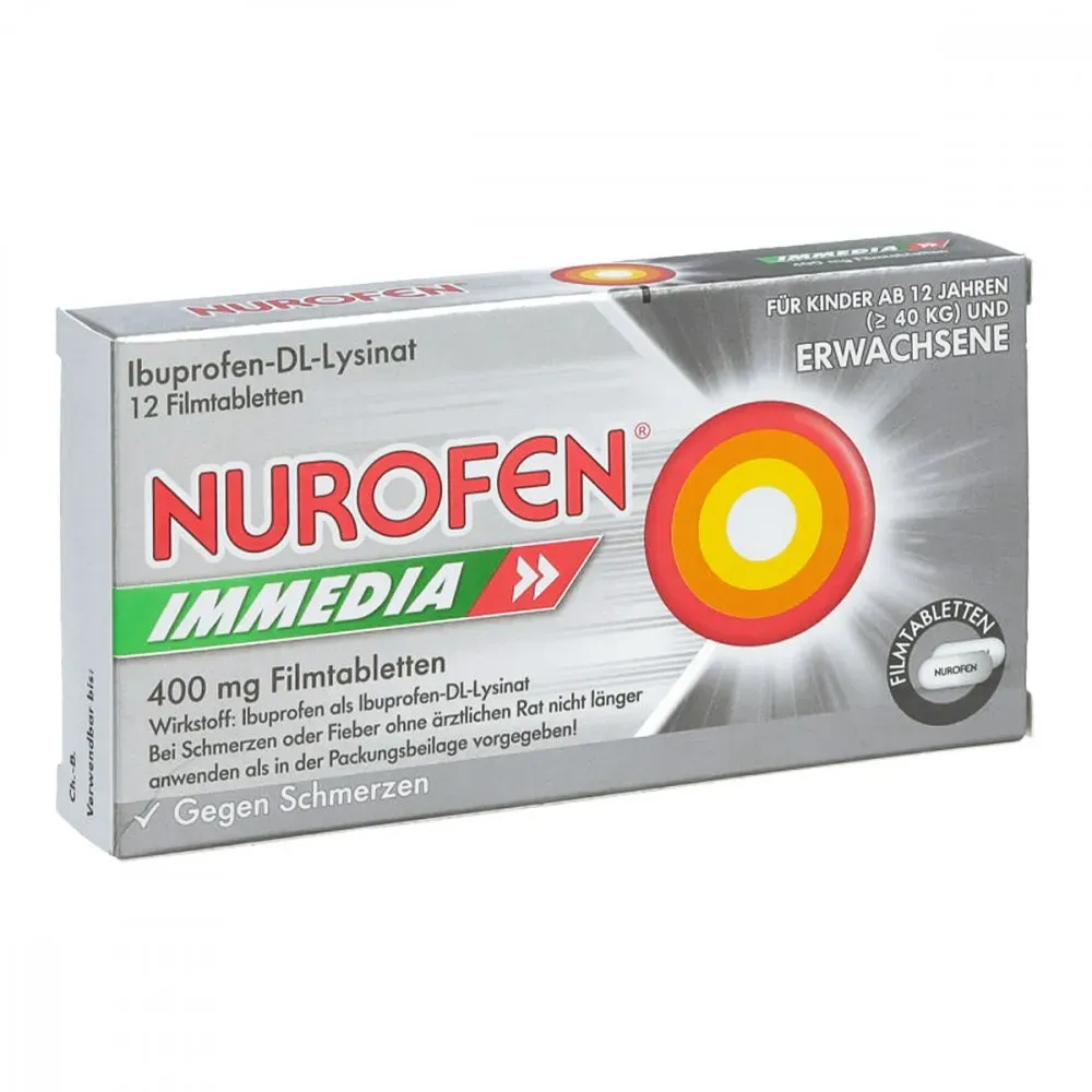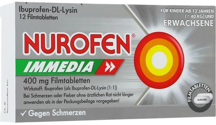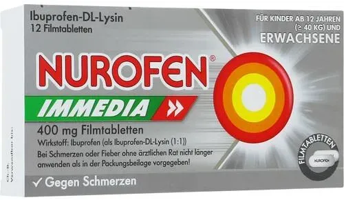 0,31 /St - Kategorie: Arzneimittel - RB Deutschland GmbH - GTIN:4002448064831 - PZN:08794442 - Nurofen Immedia 400 mg Filmtabletten - Schnell wirksame Linderung von Kopfschmerzenwirkt dank Ibuprofen und Lysin besonders schnelleffektive Schmerzlinderungangenehm zu schluckenschon für Jugendliche ab 1 n und für Erwachsene geeignetSchnelle und lang anhaltende SchmerzlinderungBei akuten Schmerzattacken kann Nurofen Immedia 400 mg in der 12-Stück-Packung für eine schnelle und langanhaltende Beseitigung der Beschwerden sorgen. Die seit Jahrzehnten bewährte Substanz Ibuprofen stoppt den Schmerz, während die Aminosäure Lysin dafür sorgt, dass der Wirkstoff schneller an den Ort des Geschehens transportiert wird. Durch die verbesserte Aufnahme des Analgetikums (Schmerzstillers) im Körper lassen die Beschwerden umgehend nach für bis zu 8 Stunden. Das Medikament ist bereits für Jugendliche ab 1 n geeignet.Dreifach wirksam, vielseitig anwendbarDank seiner dreifachen Wirksamkeit als Schmerzstiller, Entzündungshemmer und Fiebersenker kommt Ibuprofen längst nicht nur bei der Behandlung von Kopfschmerzen zum Einsatz. So eignet sich Nurofen Immedia 400 mg in der handlichen 12er-Box auch zur Linderung von Migräne, Zahnschmerzen, Schulterschmerzen, Nackenschmerzen, Gliederschmerzen und Gelenkschmerzen. Das Präparat stoppt leichte bis mäßig starke Regelschmerzen und bietet vielen Frauen zuverlässige Hilfe bei Unterleibskrämpfen während der Periode. Ebenso eignet es sich zur Senkung von ... Apolux.de hat 12 Tabletten für 3.85 Euro im Angebot, eine weitere preiswerte Option. ![]() ![]() RB Deutschland GmbH NUROFEN Immedia 400 mg Ibuprofen Filmtabletten
