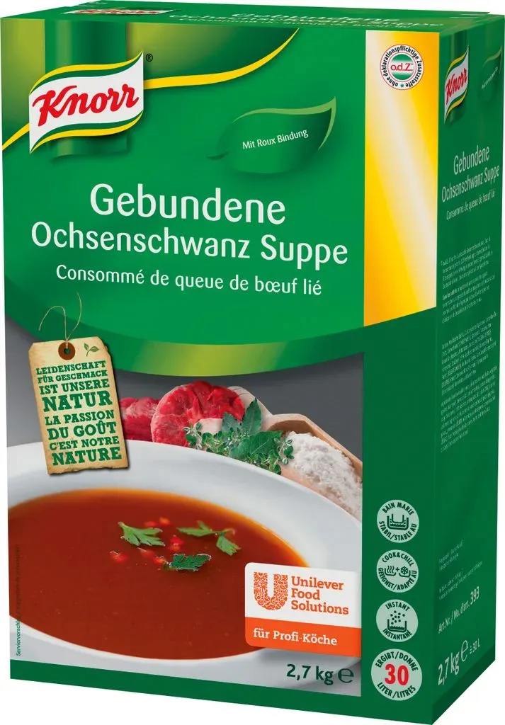 Zustand: Neu - Tütensuppen - Knorr Unilever Germany Food Solutions - 393 - EAN: 4007801103936 - Produkte für die professionelle Küche, Großverbraucher und Notvorrat Lebensmittel Trockenmischung für die Zubereitung einer gebundenen Ochsenschwanzsuppe Klare Suppe mit kräftigem Oxtail Geschmack und Rosmarinnote Ochsenschwanzsuppe beinhaltet Gemüse aus dem Knorr Programm Anbau für die Zukunft Schnelle und einfache Zubereitung einer leckeren Ochsenschwanzsuppe Mit klassischer Rouxbindung - Verkäufer: Mega-Paradies GmbH im amazon.de Marketplace Diese Unilever Deutschland Knorr Gebundene Ochsenschwanzsuppe ist eine sehr große Packung für den professionellen Gebrauch. ![]() ![]() Unilever Deutschland Knorr Gebundene Ochsenschwanzsuppe