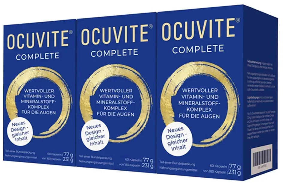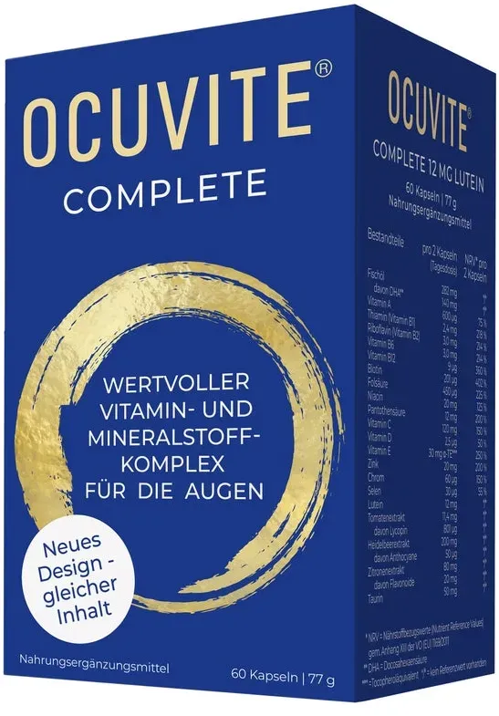 Verfügbarkeit: 1-2 Werktage - 0,61 €/St - Kategorie: Nahrungsergänzungsmittel - Bausch + Lomb - GTIN:4030571005698 - PZN:04871513 - Ocuvite Complete 60 St - rezeptfrei - von Dr. Gerhard Mann - Chemisch-pharmazeutische Fabrik GmbH - Kapseln - 60 St - 36,33 Euro bei DocMorris Apotheke - gefunden von billiger.de Dieses Angebot für die 60-Stück-Packung ist preislich attraktiv und von einem bekannten Anbieter. ![]() ![]() Bausch + Lomb Ocuvite Complete 60 St